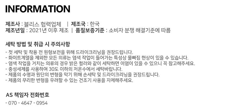 | 제조국 | 한국 | 세탁방법 및 취급시 주의사항 | 컨텐츠 참조 |