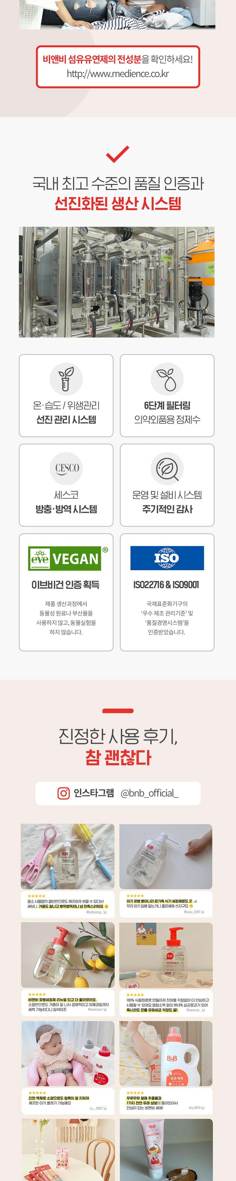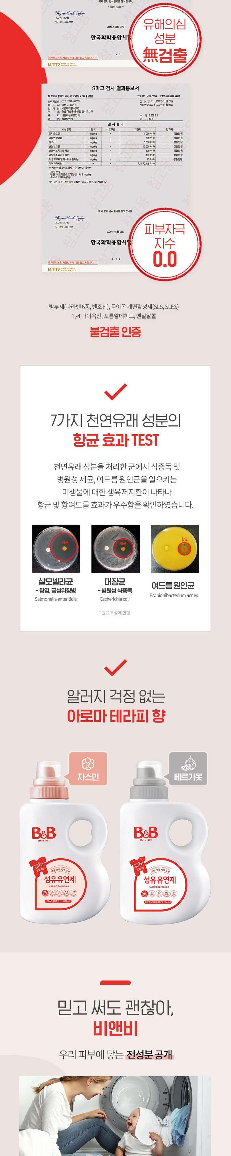 | 품목 및 제품명 | 비앤비 섬유유연제 (베르가못) | 용도(표백제의 경우 계열을 함께표시) 및 제형 | 용도:세탁제품 > 섬유유연제 > 섬유용세탁제품 > 섬유유연제 > 신발용 / 제형:액체형 |
