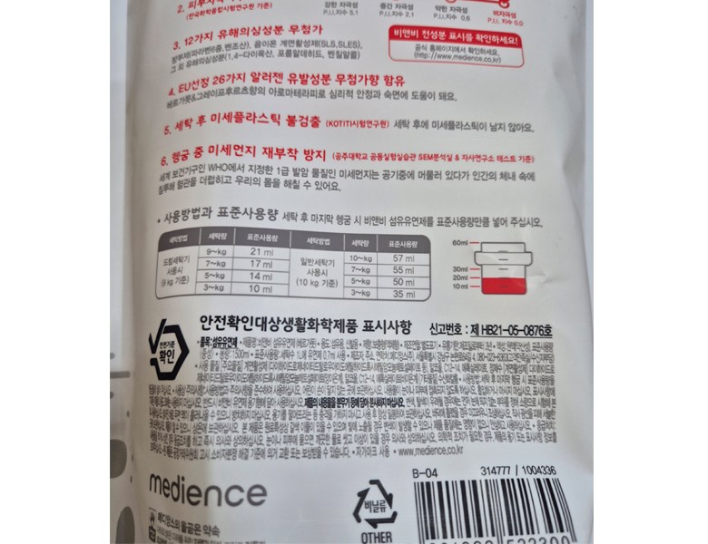 | 효과,효능 (승인대상 제품에 한함) | 1.옷감의 부드러움 2.정전기방지 3.냄새제거 및 탈취 4.항균,살균효과 5.주름방지 및 색상 보호 | 수입자(수입제품에 한함), 제조국 및 제조사 | 메디앙스(주), (06231) 서울특별시 강남구 논현로64길 4 (역삼동), 080-023-6363 |