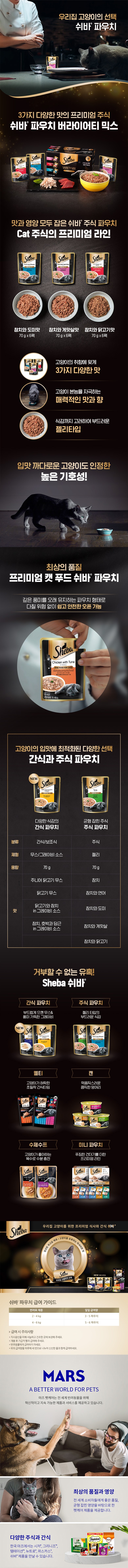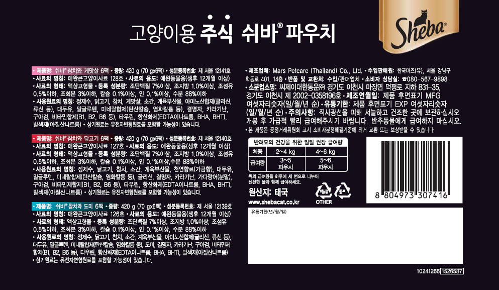 | 품명 및 모델명 | 고양이용 주식 쉬바 파우치 | 인증사항 | 사료관리법에 따른 성분등록번호 : 컨텐츠 참조 |
