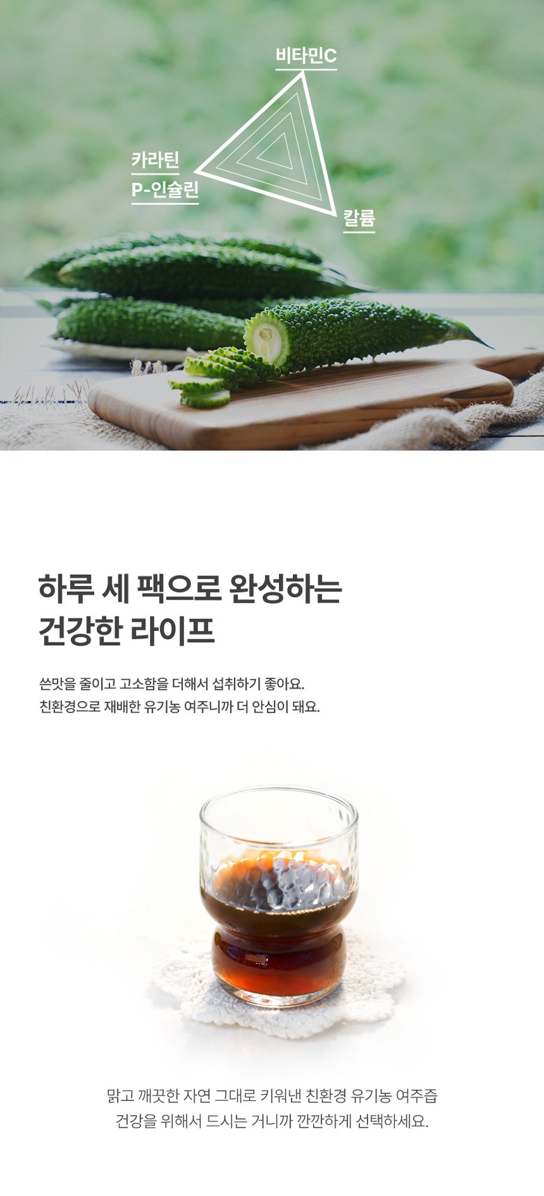 | 포장단위별 내용물의 용량(중량), 수량 | 90mlⅹ50포 / 90mlⅹ101포 | 원재료명 및 함량 | 국내산 친환경 유기농 여주 100% |
