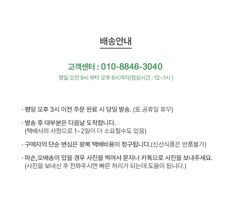 - ㆍ모니터 해상도의 차이로 인해 색상이나 이미지가 실제와 달라, 고객이 단순 변심으로 교환/반품을 무료로 요청하는 경우