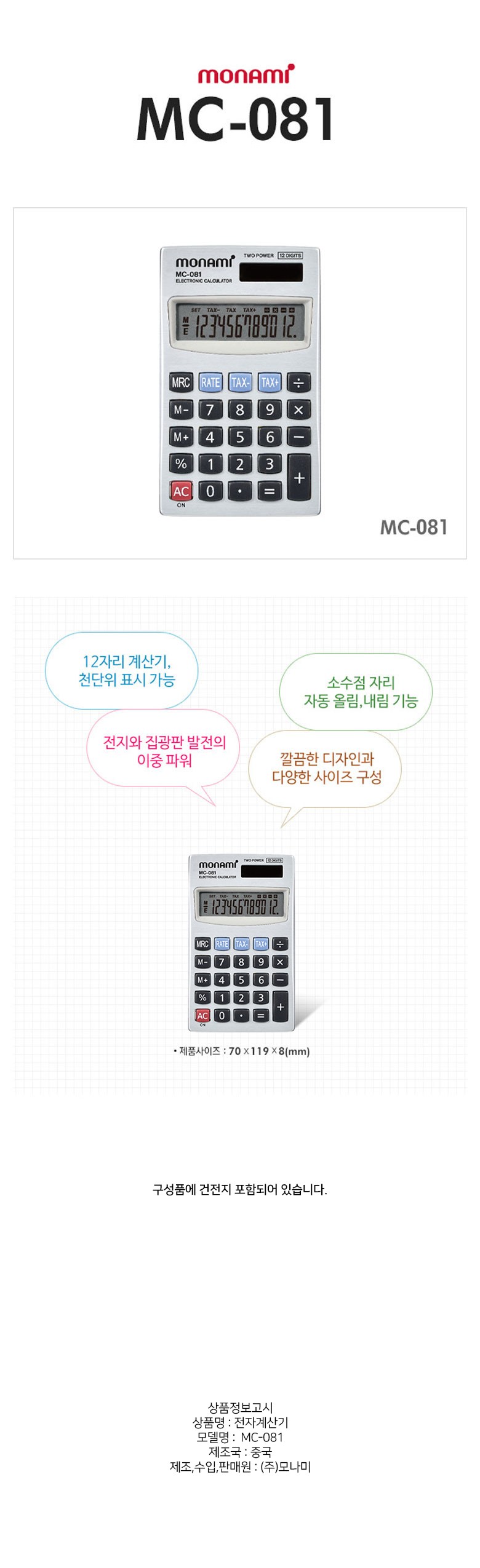 | 품명 및 모델명 | 전자계산기 MC-081 | 인증/허가 사항 | 본품 : 해당없음 / 건전지 : B052R1231-21002 |
