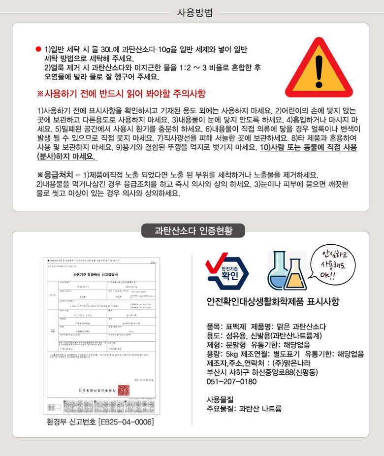 | 품목 및 제품명 | 상품 상세페이지 참조 | 용도(표백제의 경우 계열을 함께표시) 및 제형 | 상품 상세페이지 참조 |