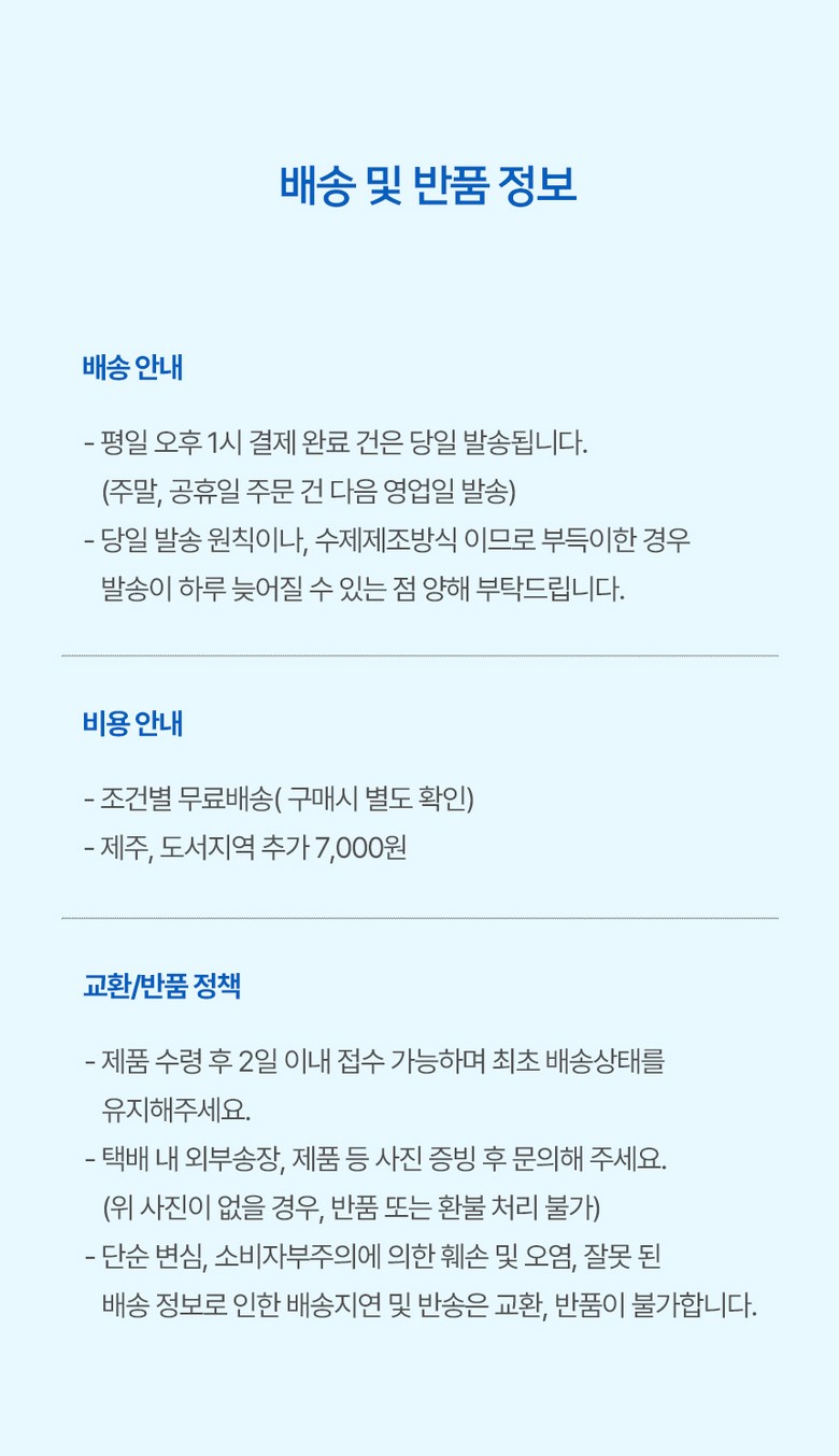 | 교환/반품 비용 (왕복비용) | 3,500원 - 단, 고객 변심의 경우에만 발생 - 도서산간 지역 배송불가 |
