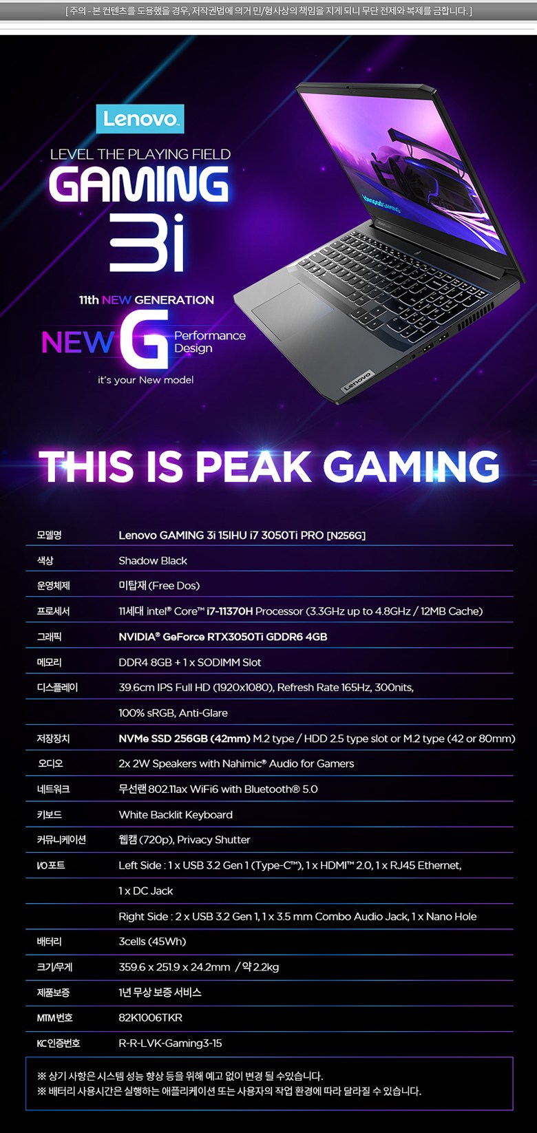 | 품명 및 모델명 | 레노버 2021 노트북 15/IdeaPad Gaming 3 15ACH6 | KC 인증정보 | 본품 : XU100309-21085A, R-R-LVK-GAMING3-82K2 / 내장배터리 : XU100459-21148A / 어댑터 : SU10473-18003 |