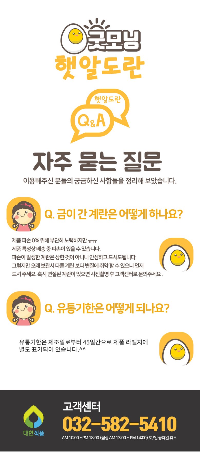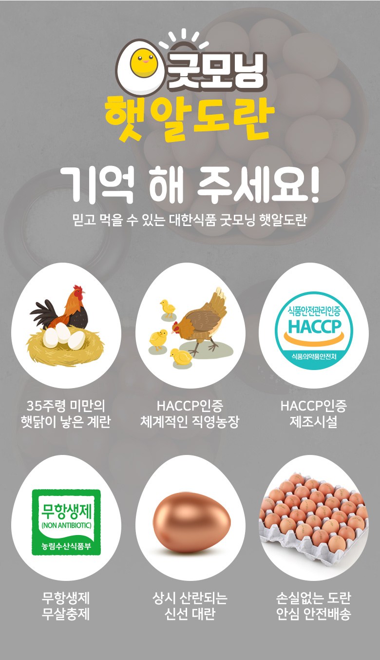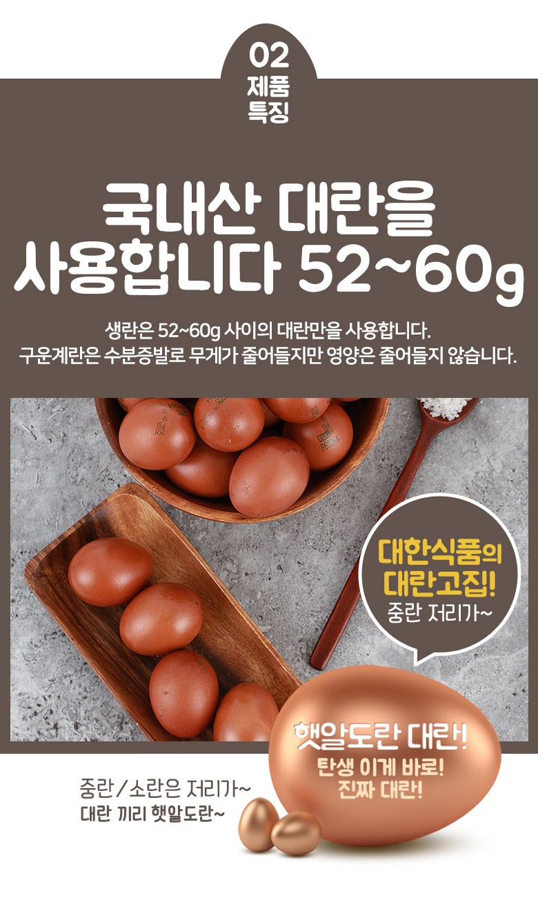 | 생산자(수입자) | 대한식품, 인천광역시 서구 중봉대로393번길 142 5동,6동 | 원산지 | 국내산 계란 100% |