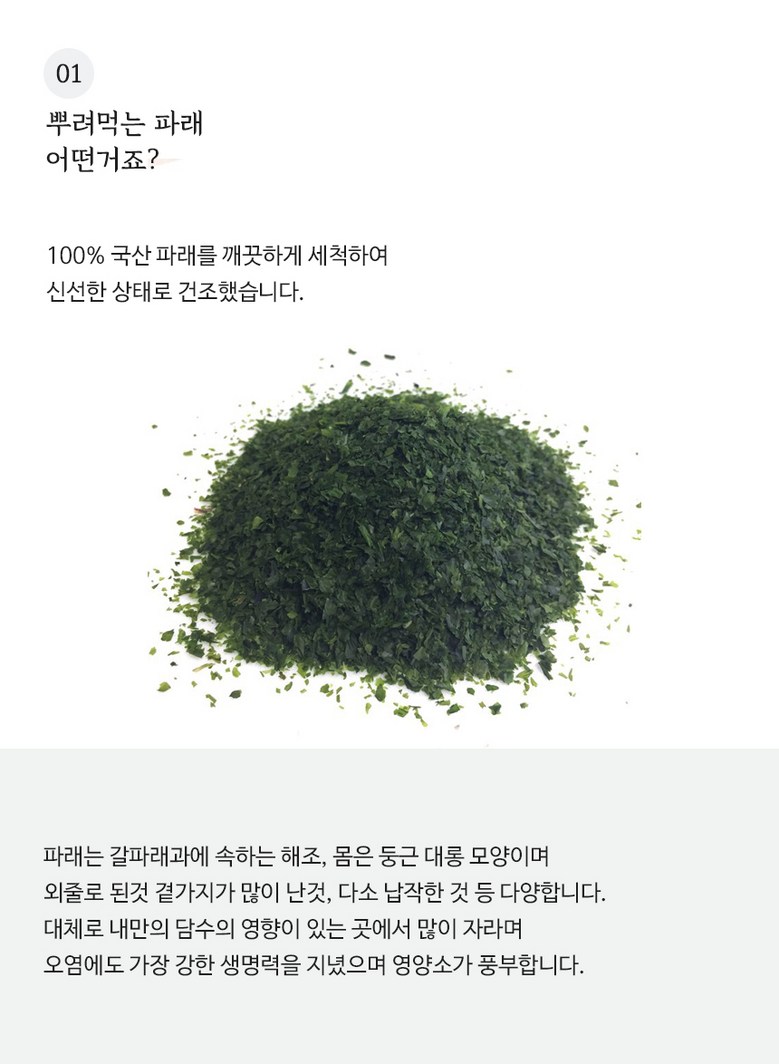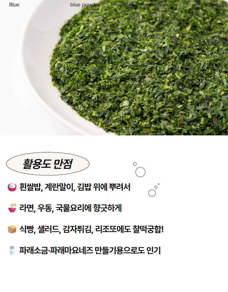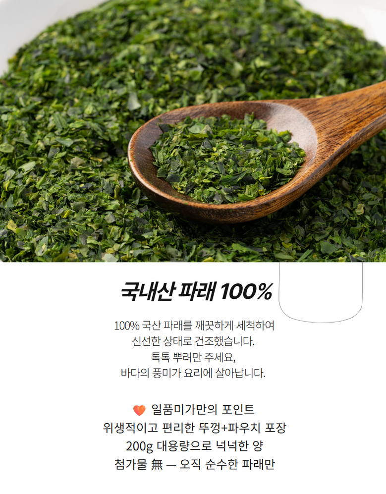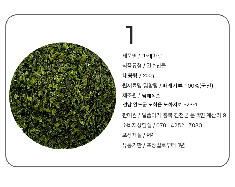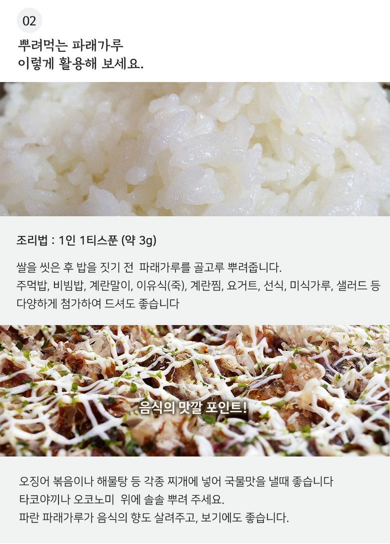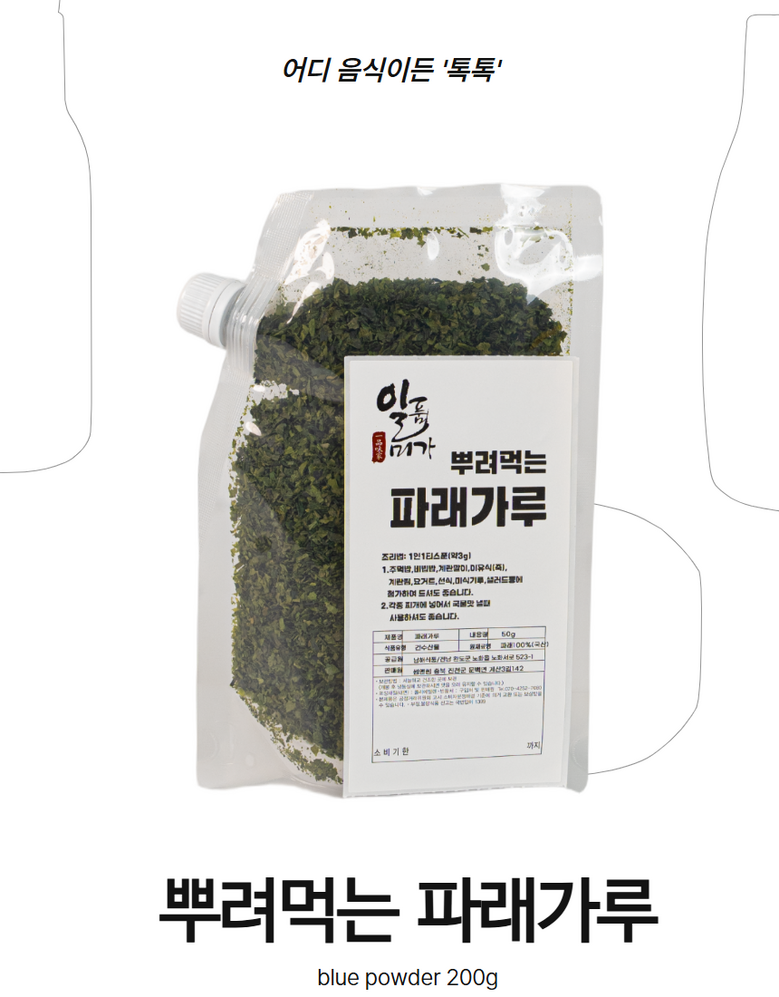| 품목 또는 명칭 | 상품 상세페이지 참조 | 포장단위별 내용물의 용량(중량),수량,크기 | 뿌려먹는 파래가루 200g |