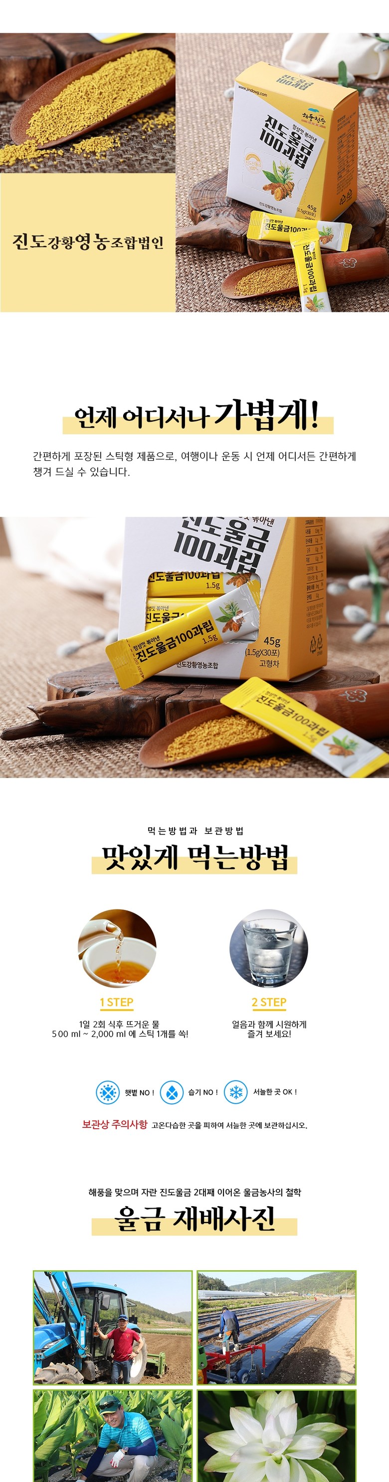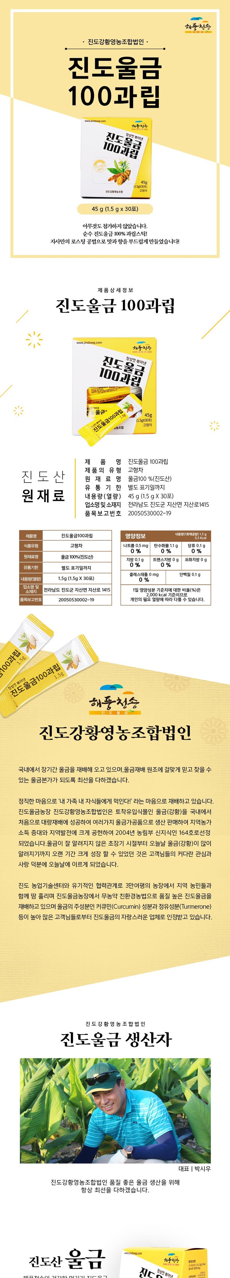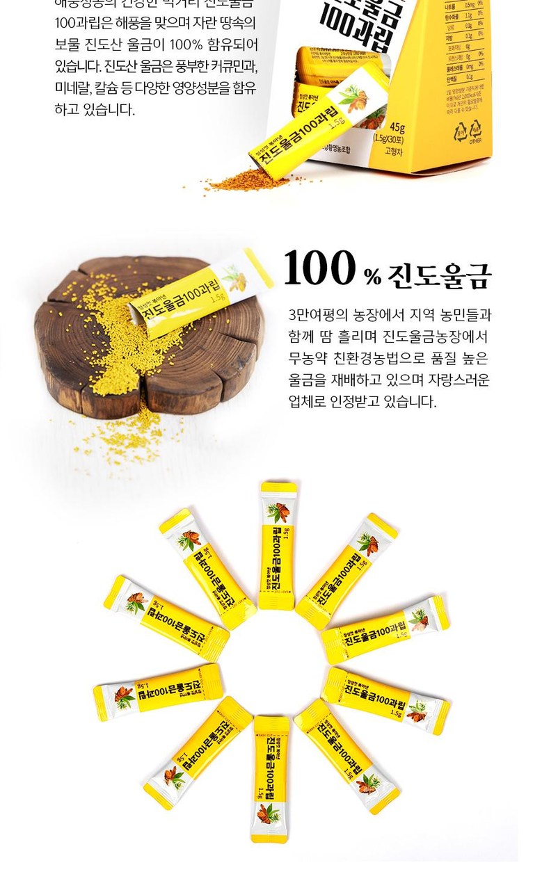 | 포장단위별 내용물의 용량(중량), 수량 | 45g [1.5g X 30포] | 원재료명 및 함량 | 울금 100%(진도산) |