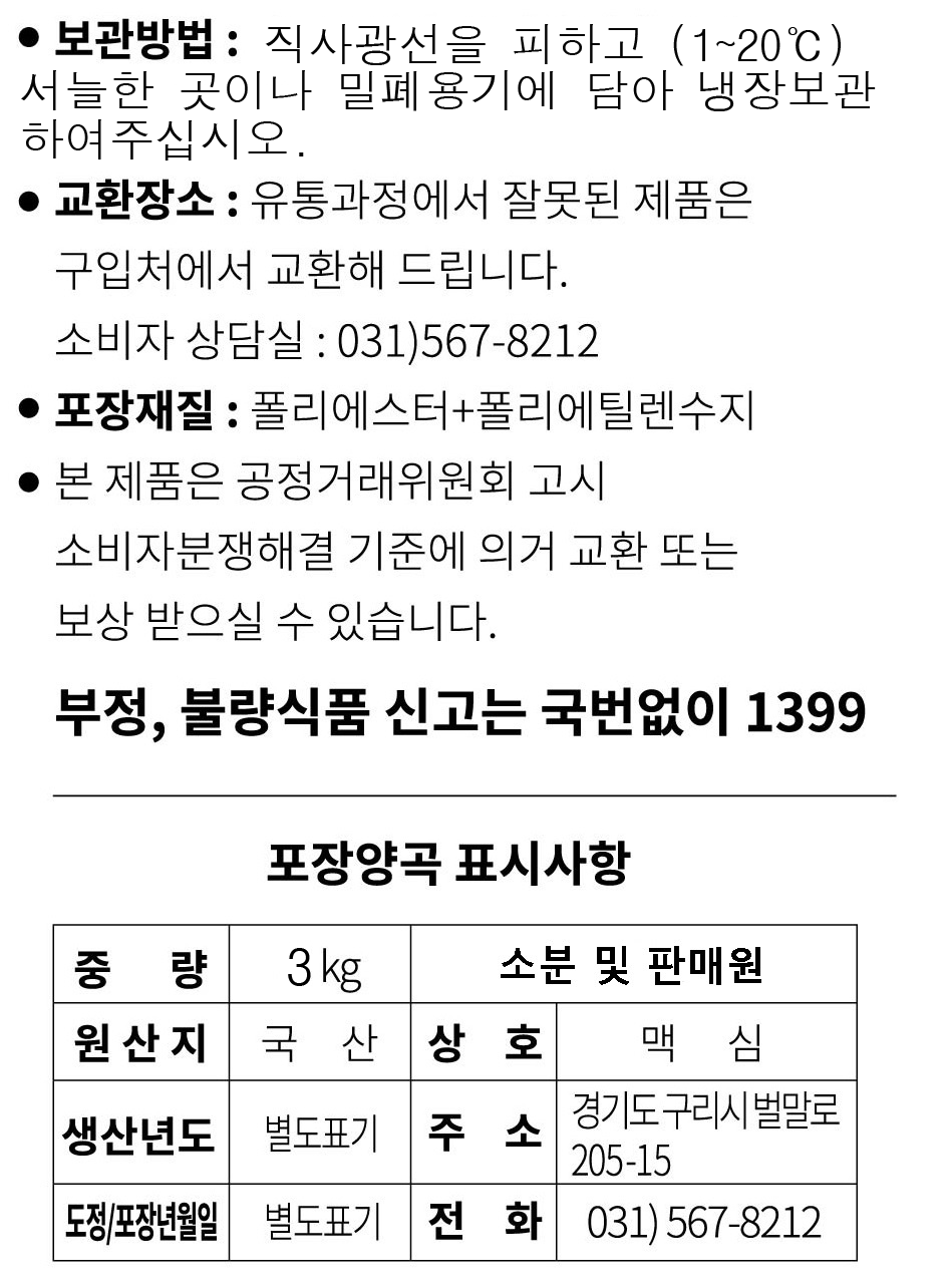 | 제조연월일, 소비기한 또는 품질유지기한 | 제조년월일 : 2025년 11월 18일 이후인 제조상품 생산일자 : 2025 | 세부 품목군별 표시사항 | 농수산물 : 유전자변형(해당 없음) / 지리적 표시사항(해당 없음) |