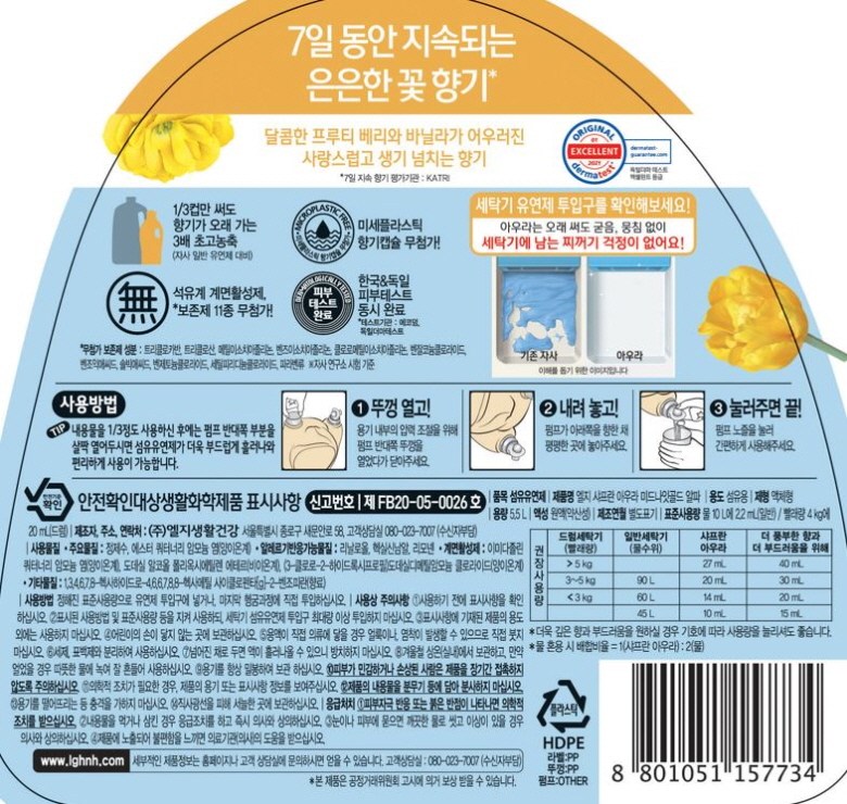 | 품목 및 제품명 | 섬유유연제 / 엘지 샤프란 아우라 미드나잇골드 알파 | 용도(표백제의 경우 계열을 함께표시) 및 제형 | 섬유용 / 비분사형-액체형 |