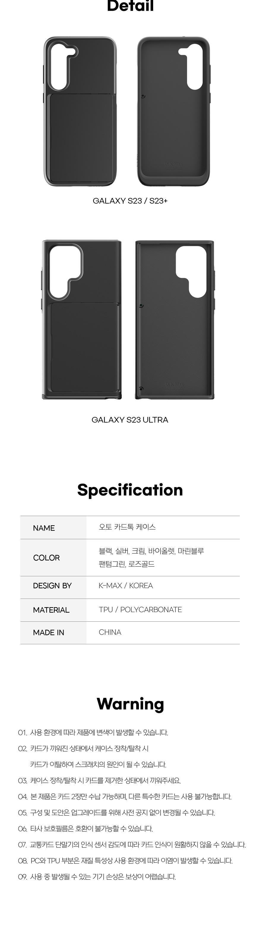 | 품명 및 모델명 | 케이맥스 오토 카드톡 케이스 -갤럭시 s23 실버 | 인증/허가 사항 | 해당없음 |