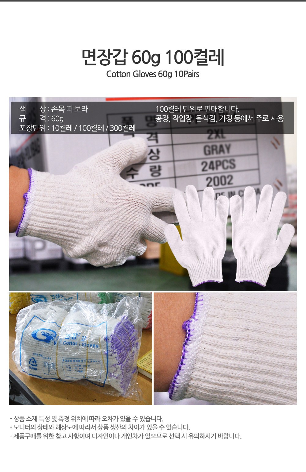 | 품명 및 모델명 | 가드맨 면장갑 60g 양손 세트 보라(손목 띠) 100세트 | 인증/허가 사항 | 알수없음(업체미제공) |