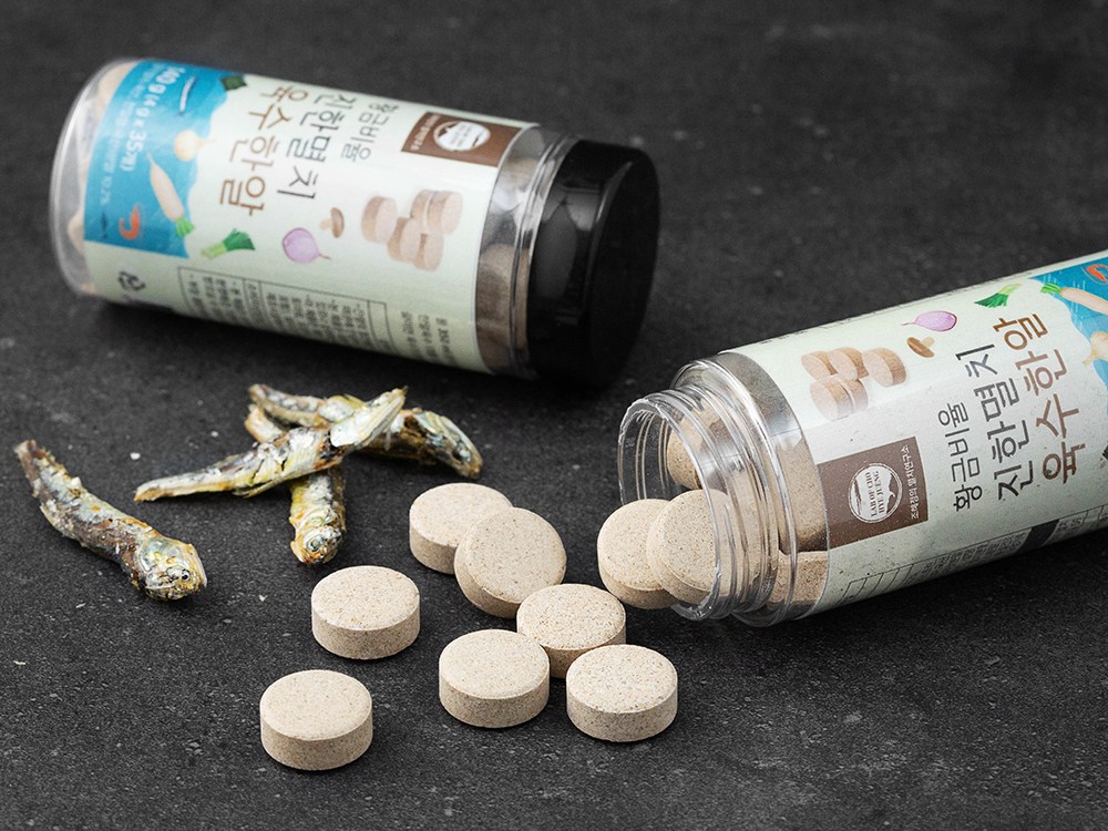 한 알이면 진하고 깊은 육수를 손쉽게 완성할 수 있는 진한멸치 육수한알이에요. 동그랗고 앙증맞은 몸에 멸치분말, 바지락엑기스분말 등의 감칠맛을 가득 품었답니다. 한 알 속에 다채로운 재료가 어우러져 있지요.