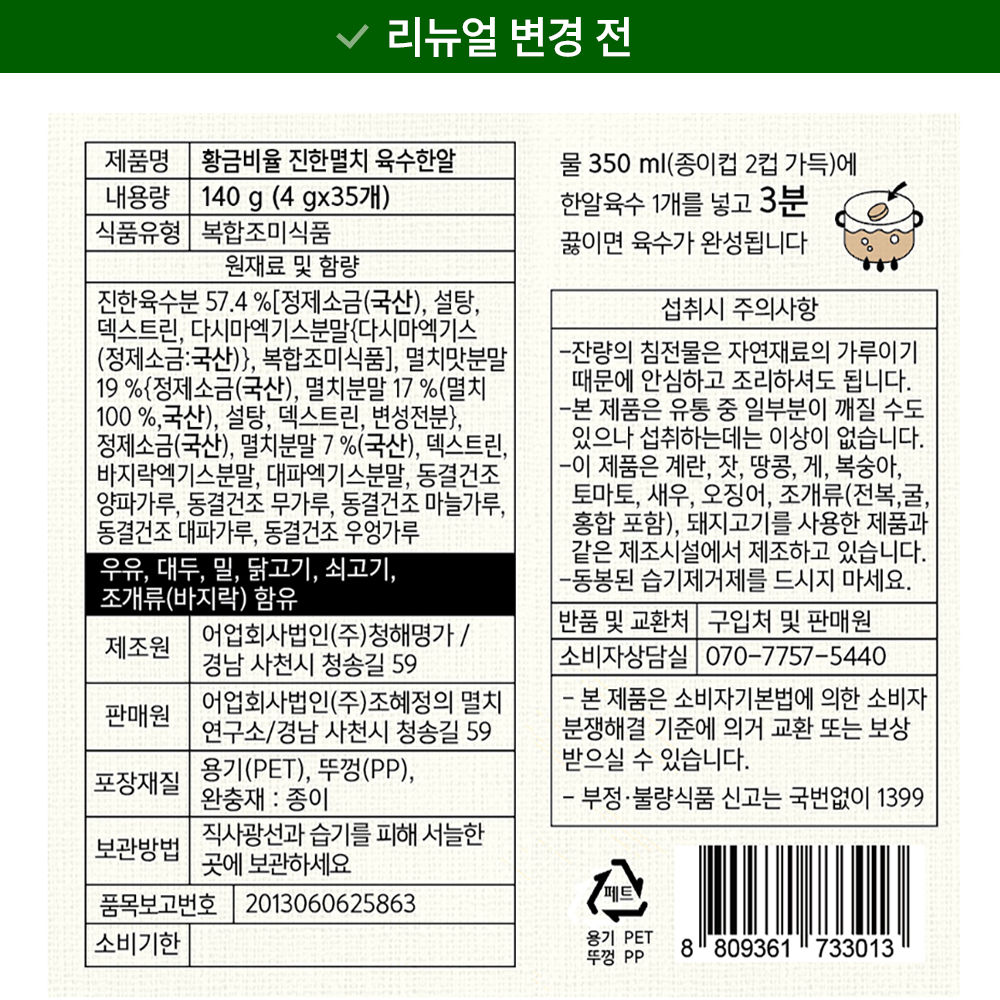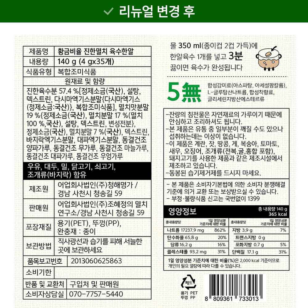물 350㎖에 육수한알 1개를 넣고 3분간 끓이면 맛있는 육수가 완성됩니다.