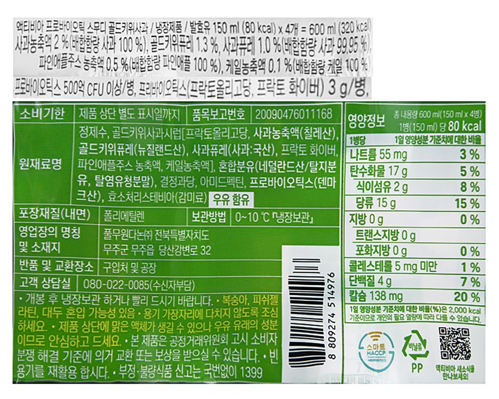 | 제품명 | 액티비아 프로바이오틱 스무디 골드키위사과 | 식품의 유형 | 컨텐츠참조 |
