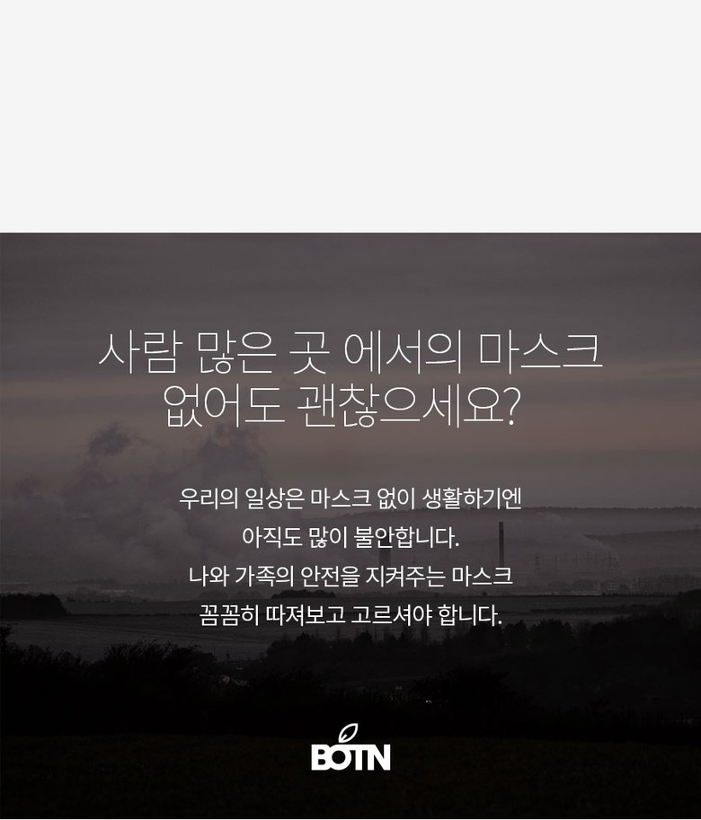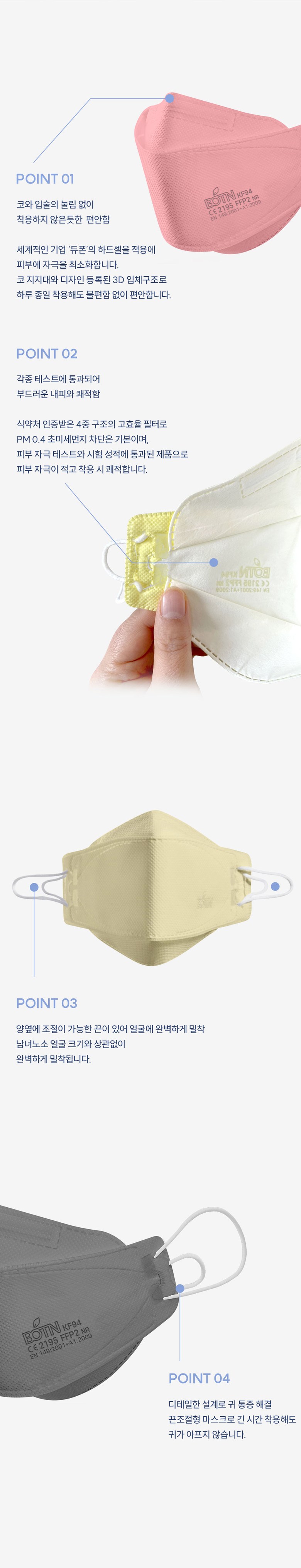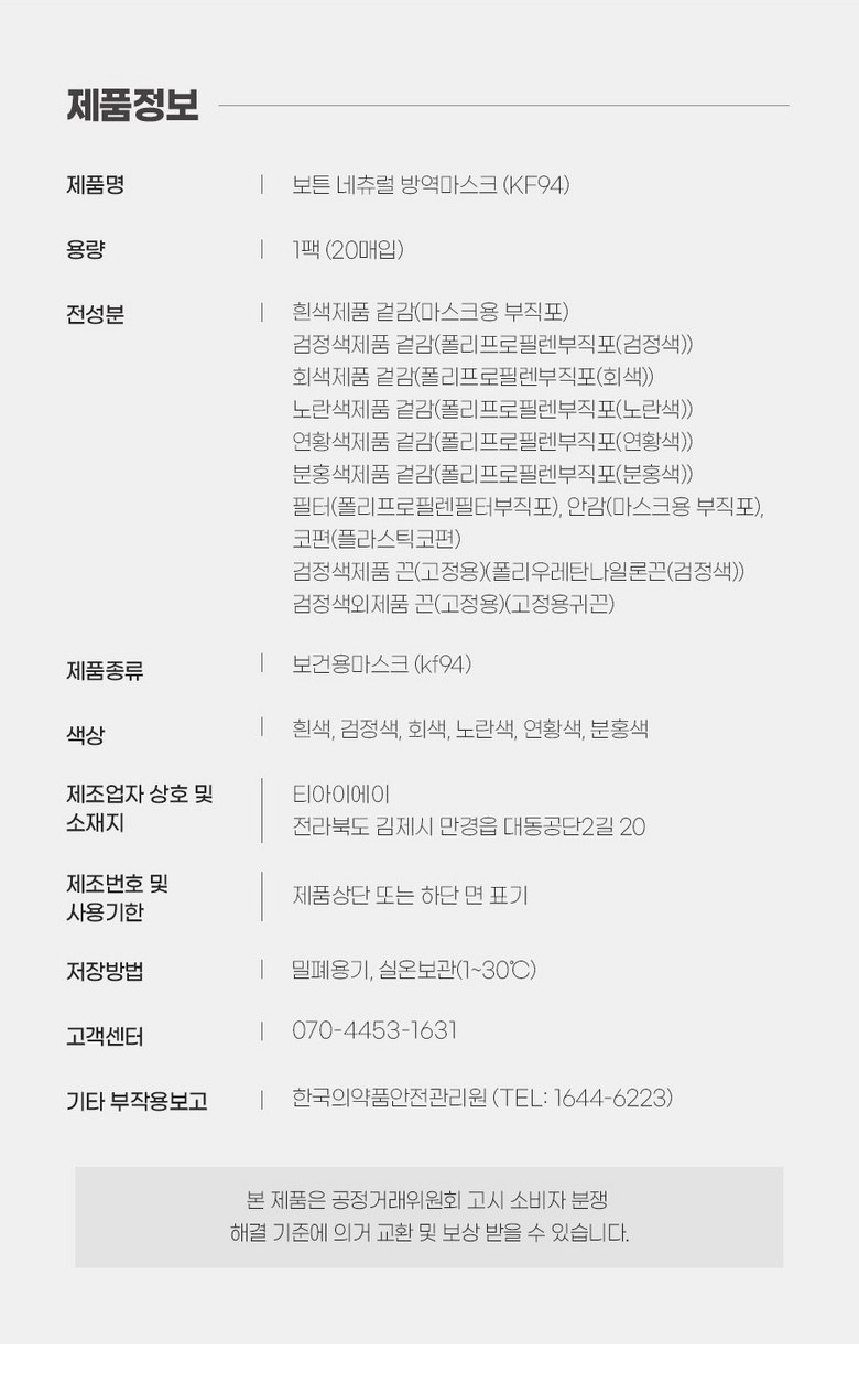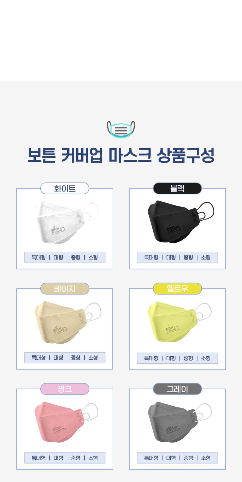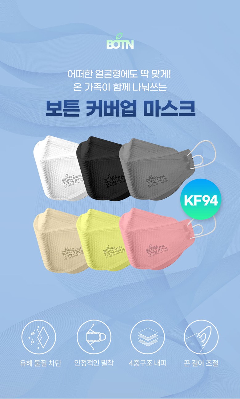 | 품명 및 모델명 | BOTN 보튼 KF94 황사 마스크 | 인증/허가 사항 | 의약외품 KF94 |