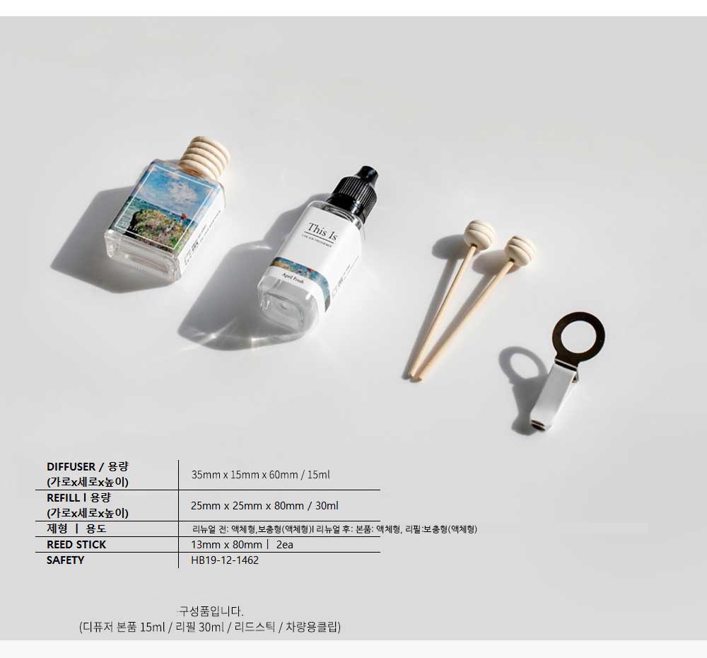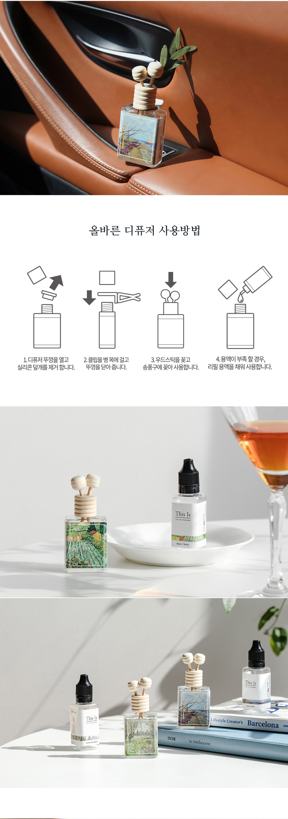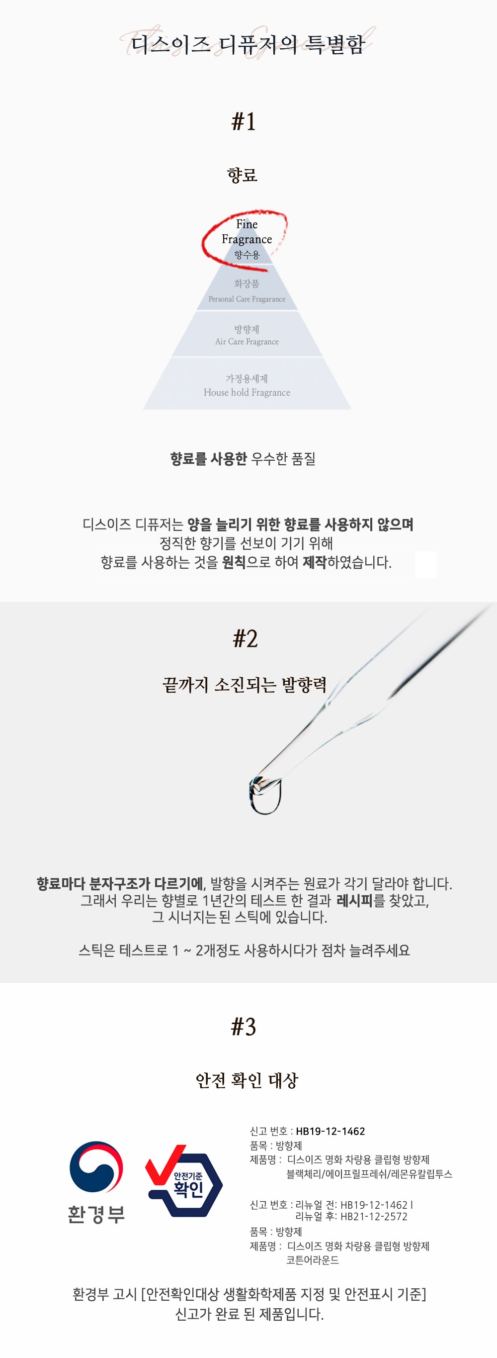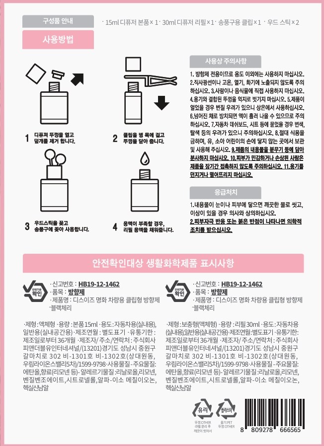 | 품목 및 제품명 | 방향제 / 디스이즈 명화 차량용 클립형 방향제-블랙체리 | 용도(표백제의 경우 계열을 함께표시) 및 제형 | 자동차용(실내용), 일반용(실내공간용) / 액체형, 보충형(액체형) |