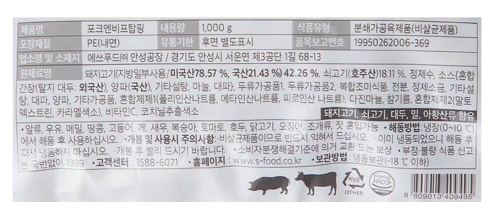 | 제품명 | 포크엔비프탑핑 | 식품의 유형 | 컨텐츠참조 |
