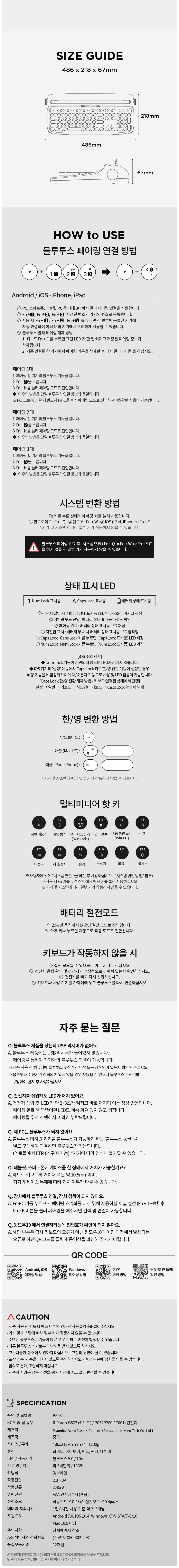 | 품명 및 모델명 | 엑토 레트로 블루투스 키보드/ B503(MINT) | KC 인증정보 | 본품: R-R-aop-B503 / 건전지: B052R380-17001 |