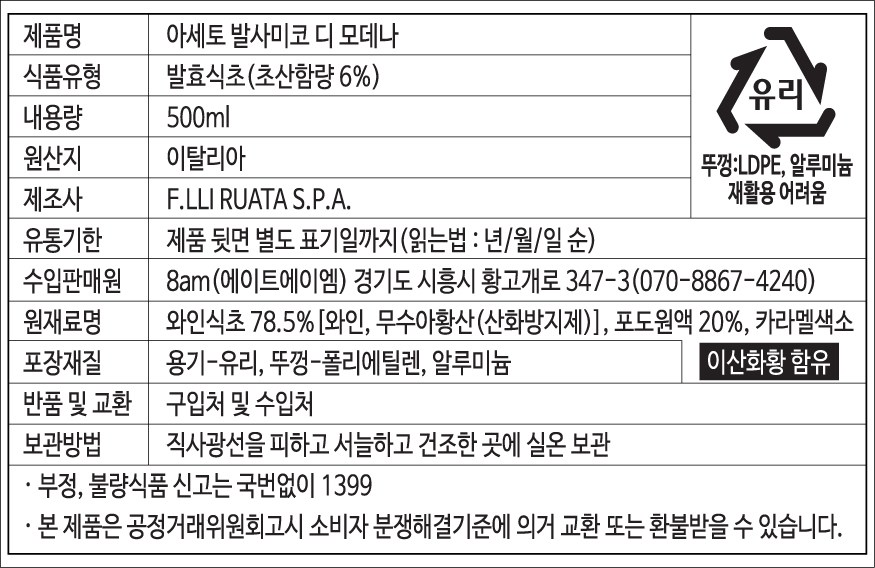 | 제품명 | 아세토 발사미코 디 모데나 | 식품의 유형 | 컨텐츠 참조 |