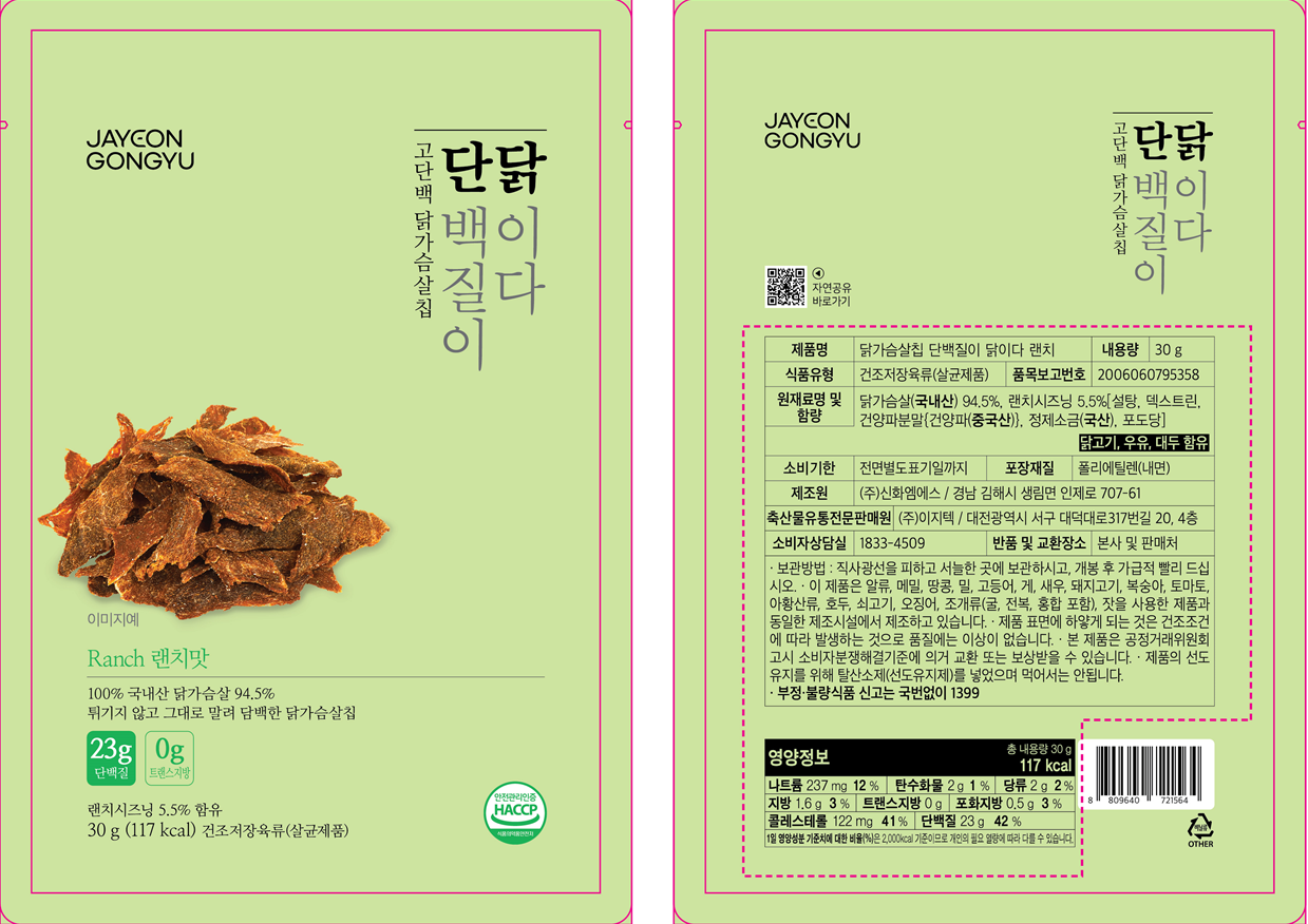 | 제품명 | 닭가슴살 칩 단백질이 닭이다 랜치 | 식품의 유형 | 건조저장육류(살균제품) |