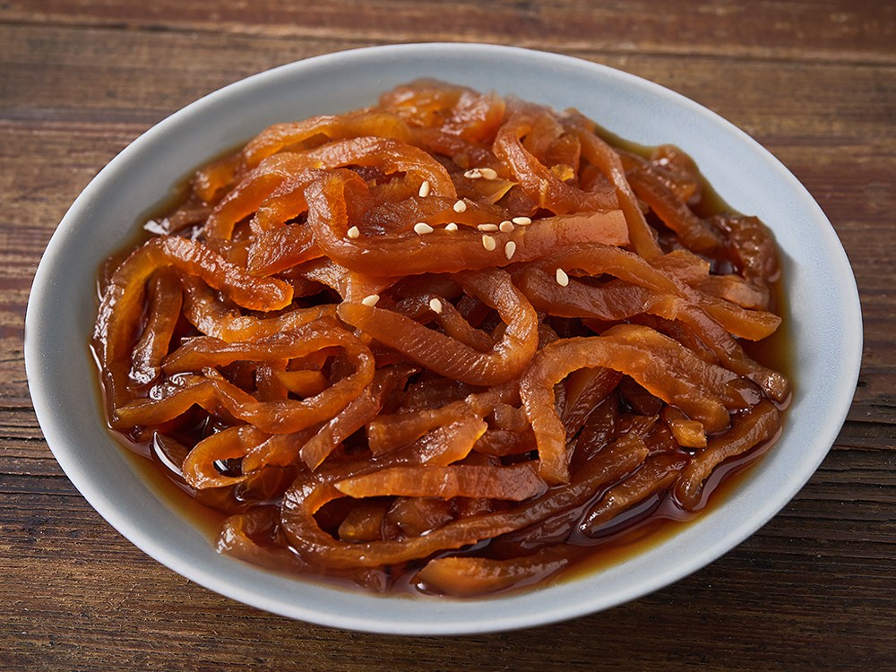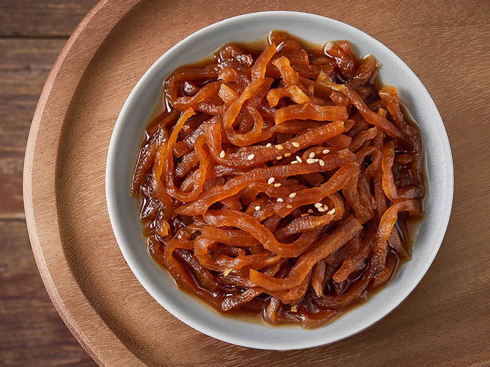 짭조름한 감칠맛을 자랑하는 무채 장아찌예요. 꼬들꼬들한 절임무에 발효식초 등을 더했죠. 간단한 밥반찬으로 드셔도 좋고, 다양한 육류 요리에 곁들여 드셔도 좋답니다. 새콤하고 달착지근한 풍미가 입맛을 돋워줄 거예요.