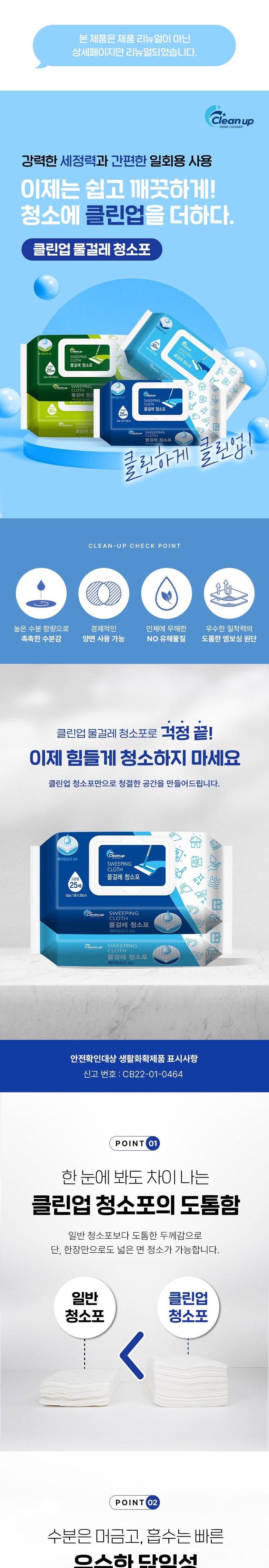 | 품목 및 제품명 | 세정제,살균제 / 클린업 물걸레 청소포 | 용도(표백제의 경우 계열을 함께표시) 및 제형 | 기타표면세정용(실내바닥용), 일반용(일반물체용) |