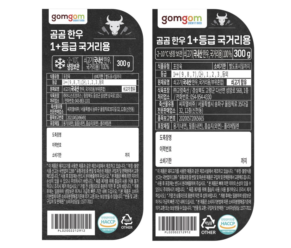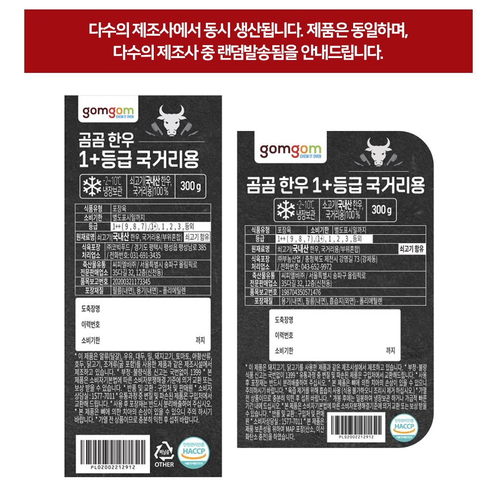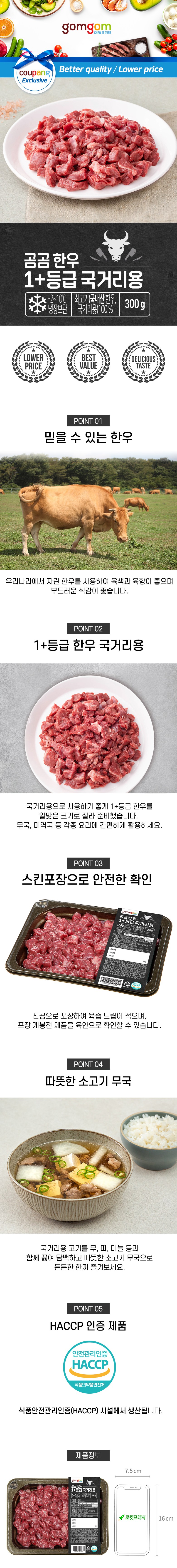 | 품목 또는 명칭 | 곰곰 한우 1+등급 국거리용 | 포장단위별 내용물의 용량(중량),수량,크기 | 300g x 3개,1개 |