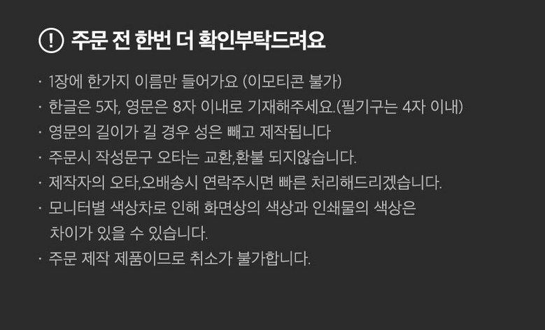 - ㆍ모니터 해상도의 차이로 인해 색상이나 이미지가 실제와 달라, 고객이 단순 변심으로 교환/반품을 무료로 요청하는 경우