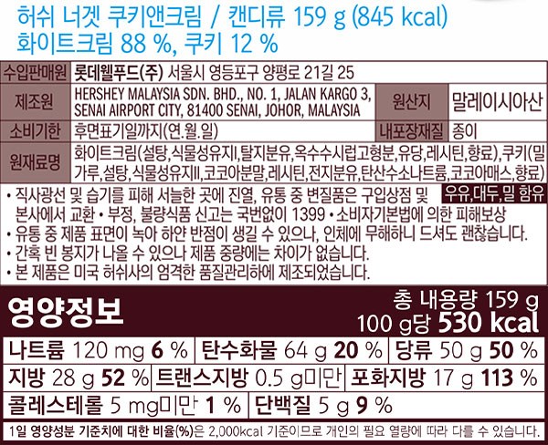 | 제품명 | 허쉬너겟쿠키앤크림(159g) | 식품의 유형 | 캔디류 |