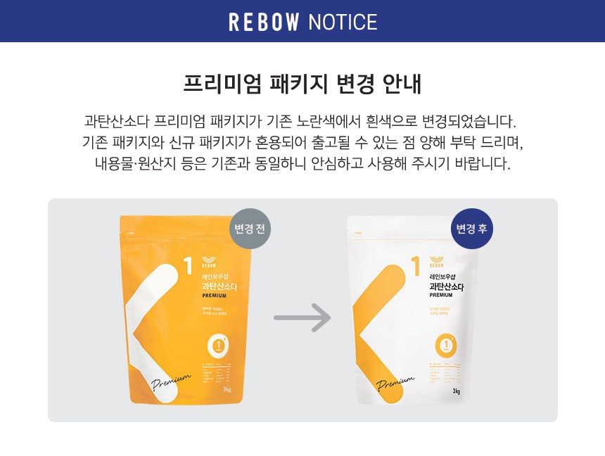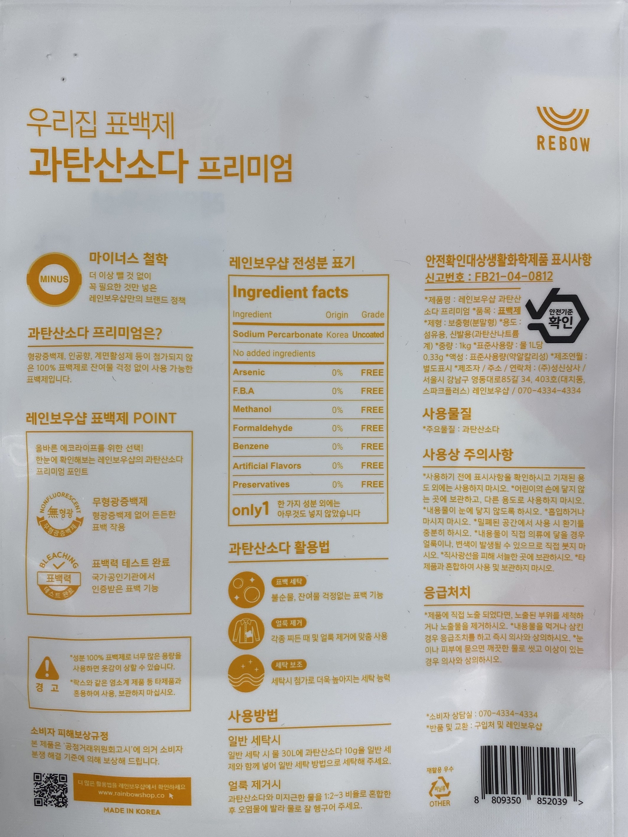| 품목 및 제품명 | 표백제 / 레인보우샵 과탄산소다 프리미엄 | 용도(표백제의 경우 계열을 함께표시) 및 제형 | 섬유용-과탄산나트륨계,신발용 / 비분사형-분말형 |