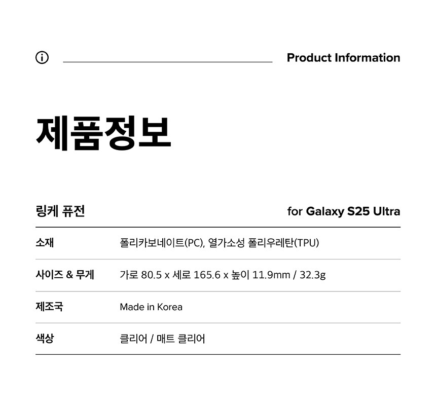 | 품명 및 모델명 | 링케 갤럭시S25 울트라 퓨전 케이스 클리어 | 인증/허가 사항 | 해당없음 |