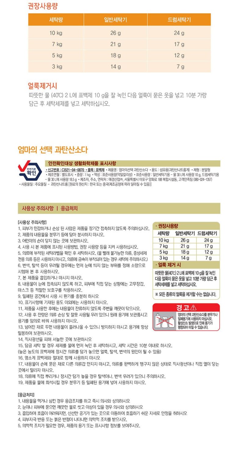 | 품목 및 제품명 | 상품 상세페이지 참조 | 용도(표백제의 경우 계열을 함께표시) 및 제형 | 상품 상세페이지 참조 |