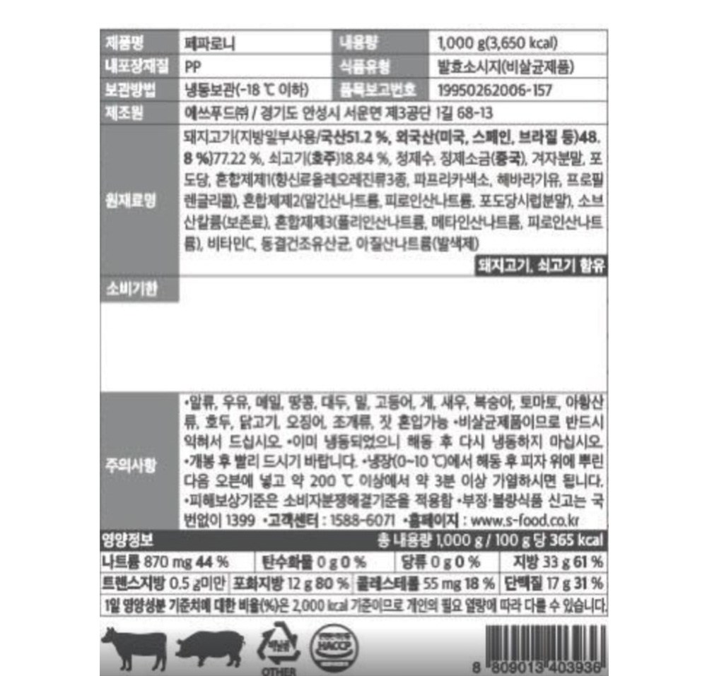 | 제품명 | 페파로니 | 식품의 유형 | 컨텐츠참조 |