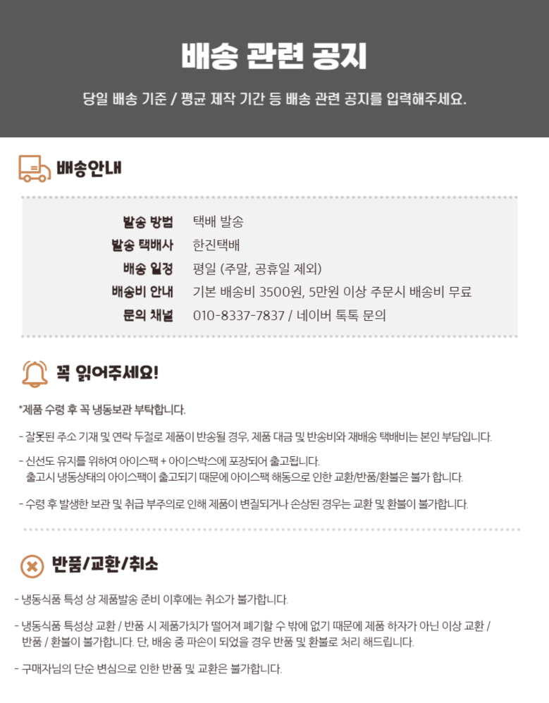 | 배송방법 | 신선/냉장/냉동 | 배송비 | 3,500원 - 도서산간 지역 배송불가 |