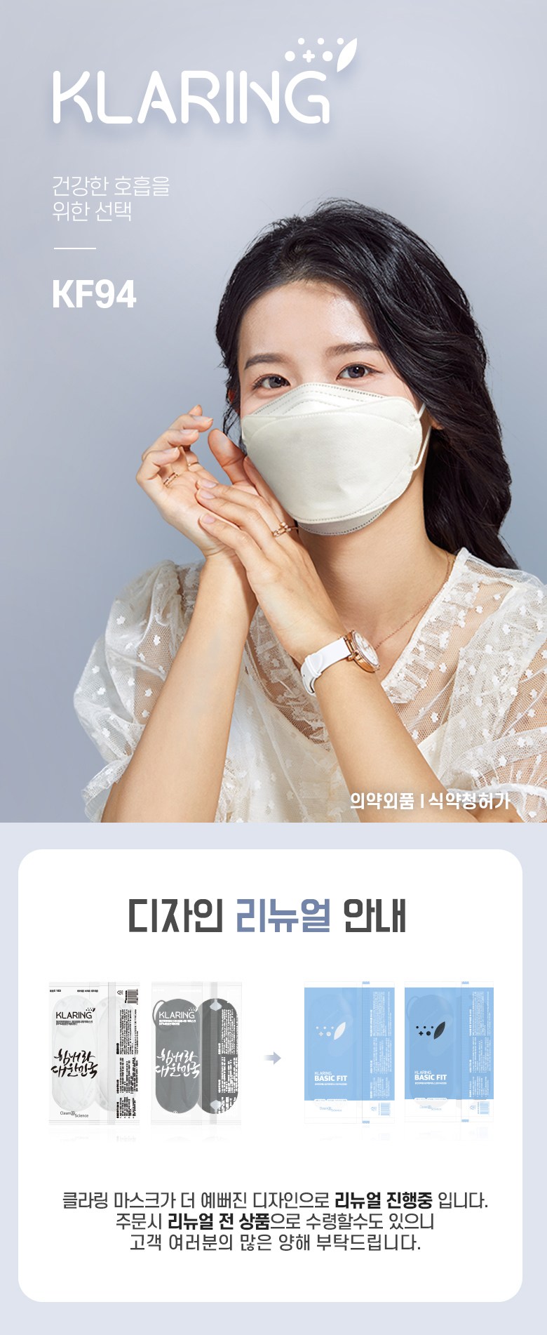 | 품명 및 모델명 | 맑은하루황사방역마스크(KF94)(중형) | 인증/허가 사항 | 의약외품 |
