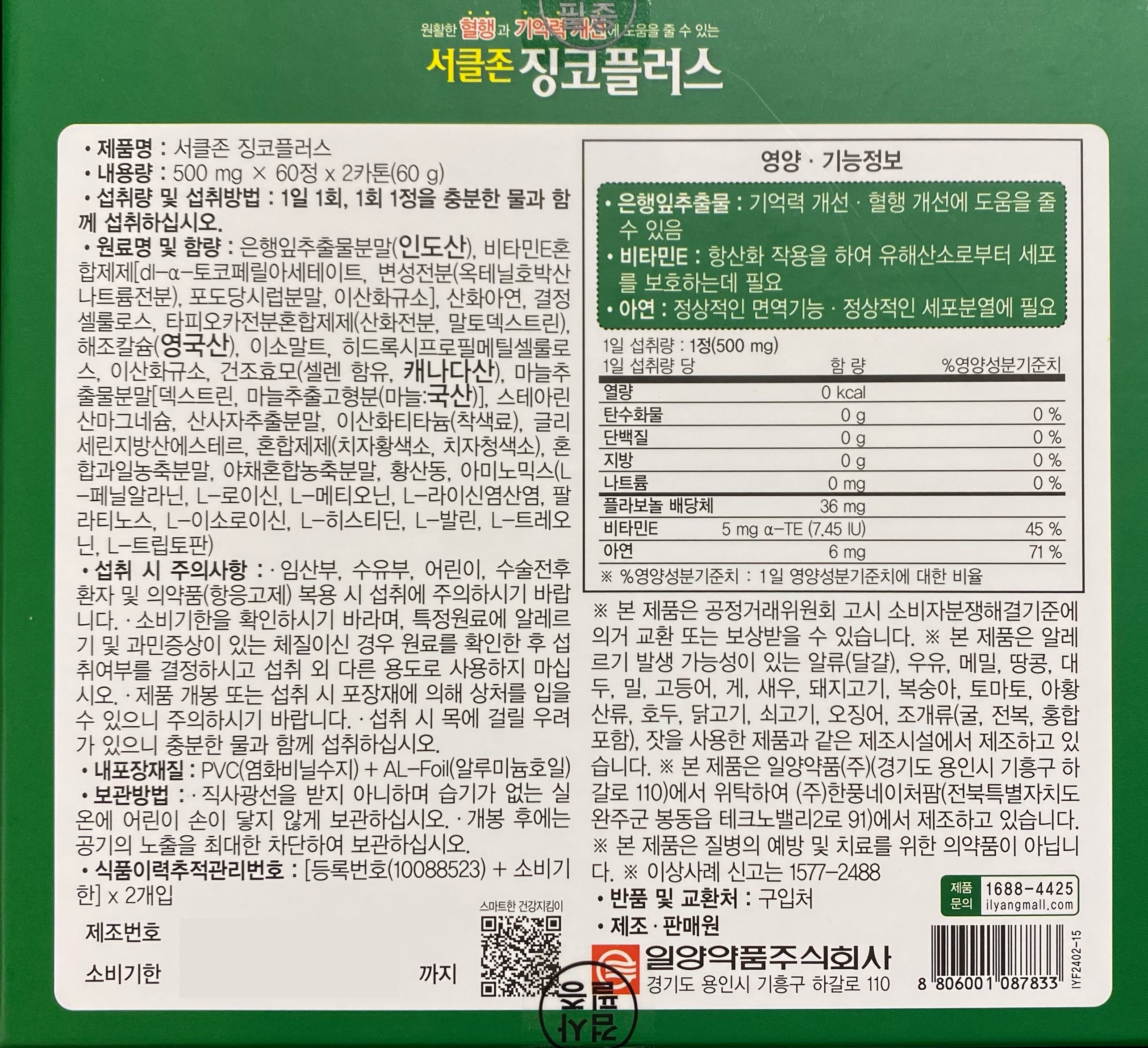 | 제품명 | 서클존 징코플러스 | 제조업소의 명칭과 소재지 | 일양약품㈜ / 경기도 용인시 기흥구 하갈로 110 |