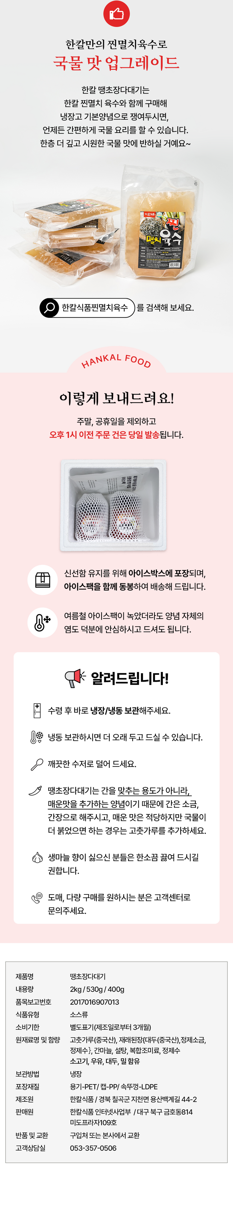 | 생산자 및 소재지 | 한칼식품/경북 칠곡군 지천면 용산리 336 | 제조연월일, 소비기한 또는 품질유지기한 | 상품 상세페이지 참조 |