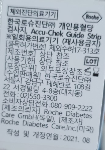 | 품명 및 모델명 | 개인용혈당검사지 / Accu-Chek Guide Strip | 허가∙인증∙신고번호 (의료기기법에 따른 허가∙인증∙신고 대상 의료기기에 한함) | 품목허가번호: 체외 수허 17-313 호 |