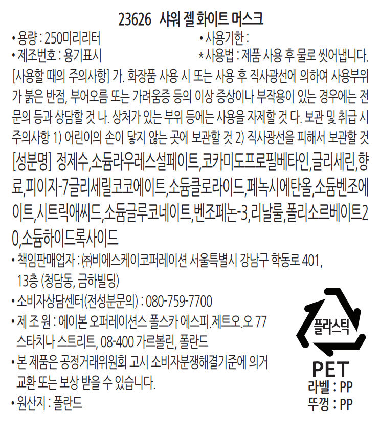 | 화장품제조업자, 화장품책임판매업자 및 맞춤형화장품판매업자 | 컨텐츠 참조 | 제조국 | 컨텐츠 참조 |