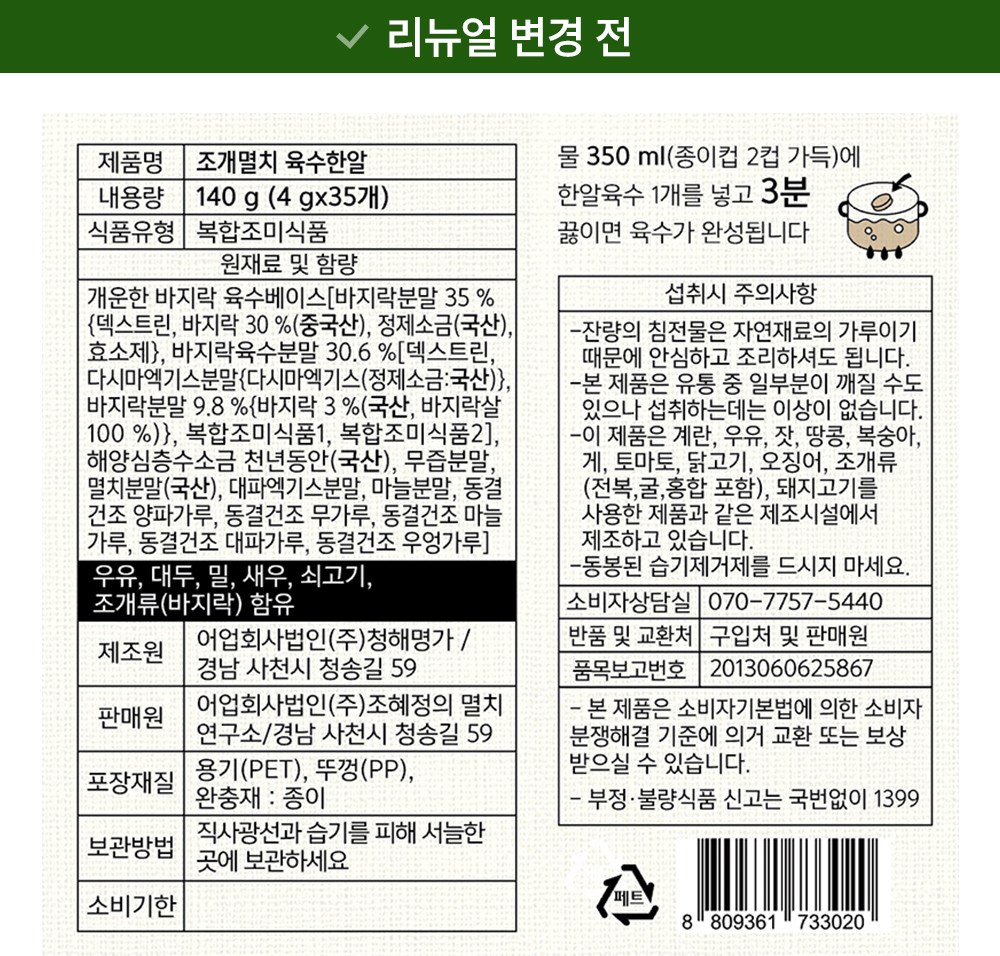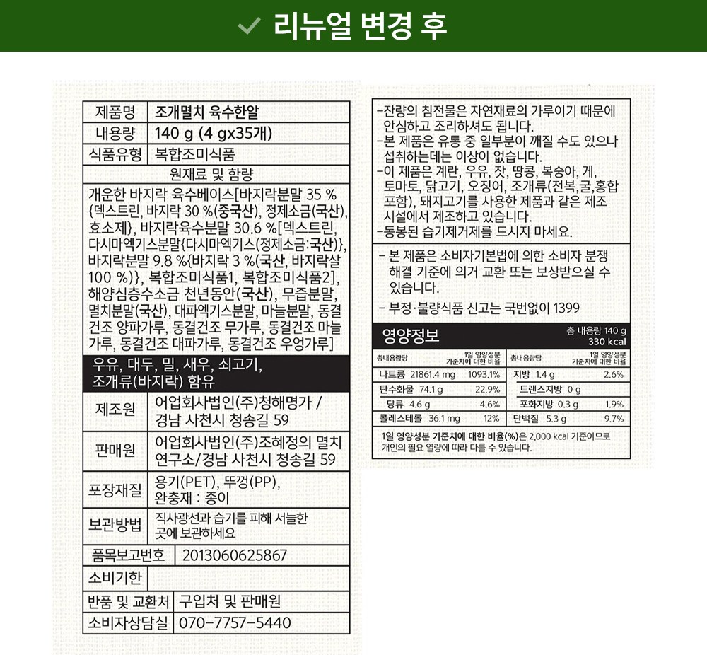 | 포장단위별 내용물의 용량(중량), 수량 | 140g x 2개 | 원재료명 및 함량 | 컨텐츠 참조 |