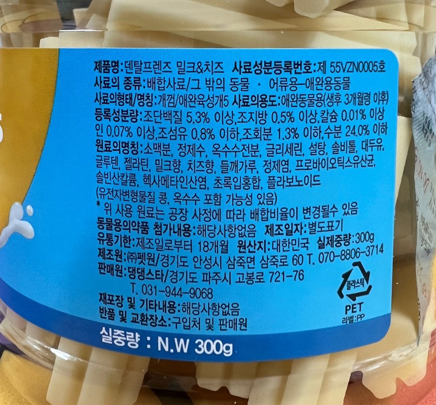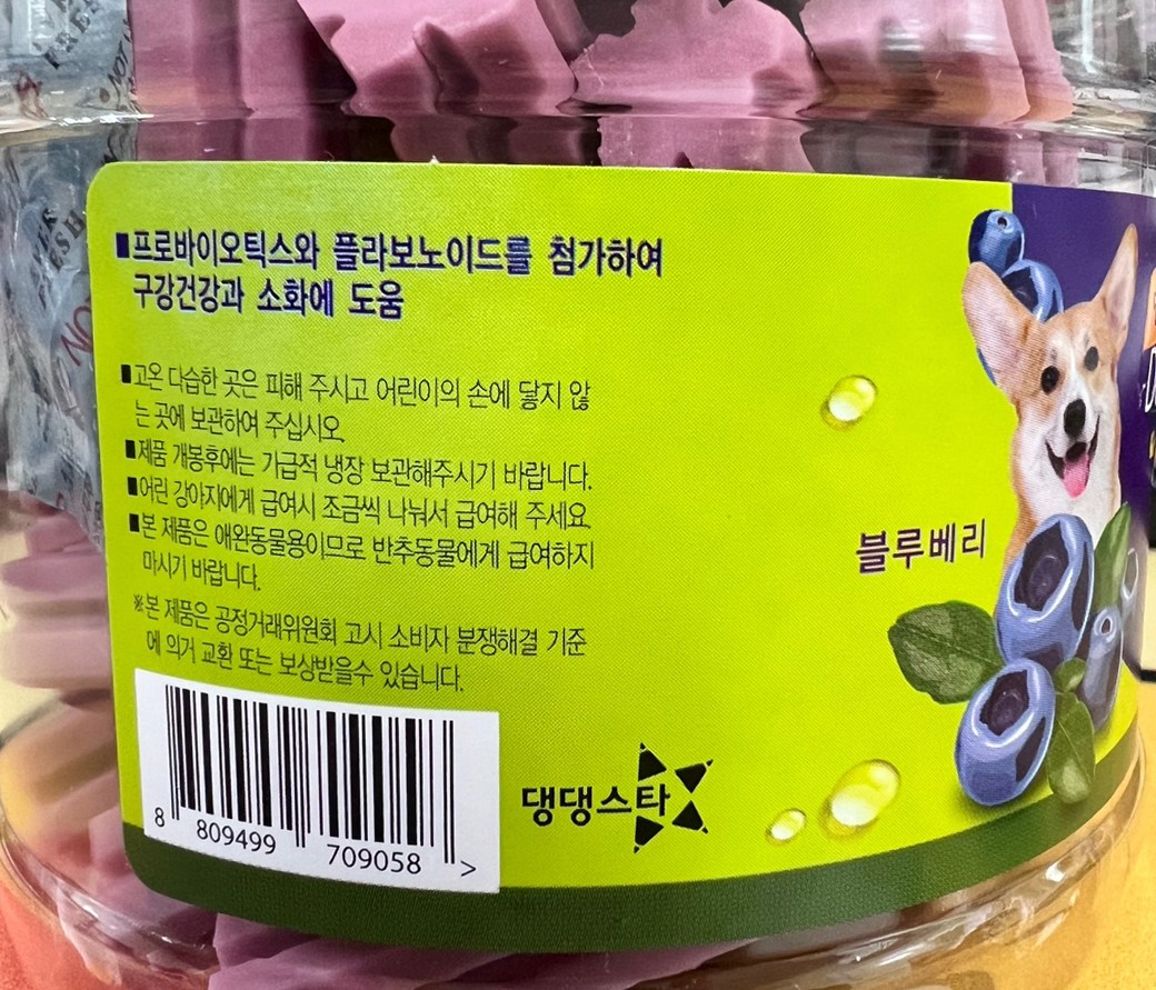 | 품명 및 모델명 | 덴탈프렌즈 블루베리 | 인증/허가 사항 | 사료관리법에 따른 성분등록번호 : 컨텐츠 참조 |
