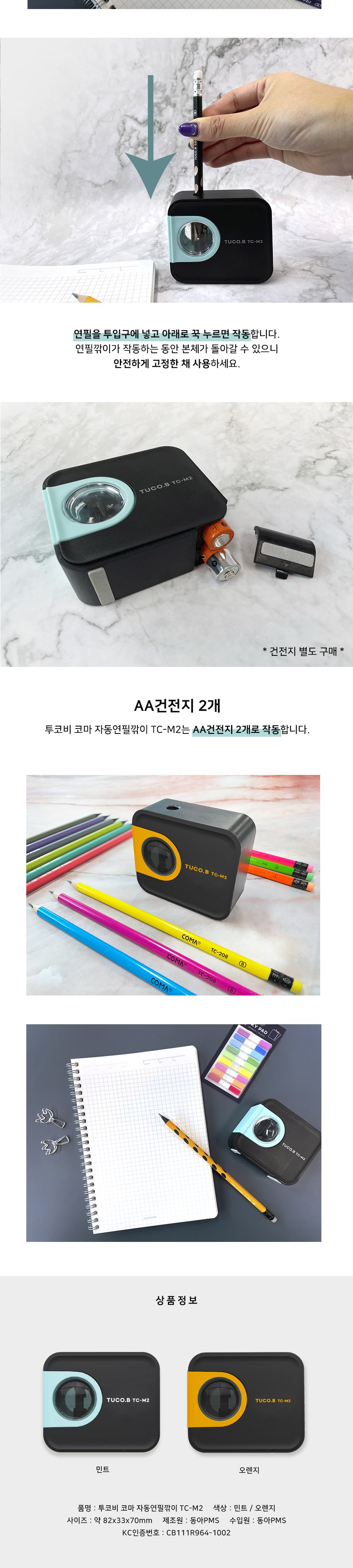 | 품명 및 모델명 | 투코비 코마 휴대용 자동연필깎이 TC-M2 오렌지 | KC 인증정보 | CB111R964-1002 |