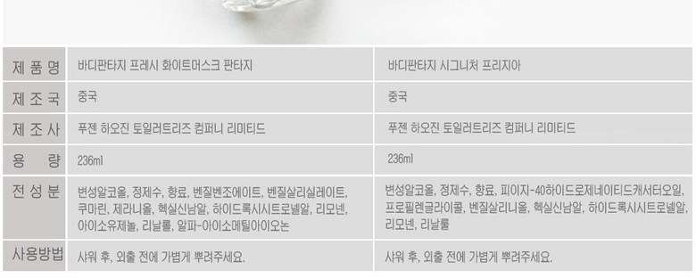| 사용기한 또는 개봉 후 사용기간 | 제조일로부터 3년 | 사용방법 | 샤워 후 온몸에 가볍게 뿌려줍니다. |