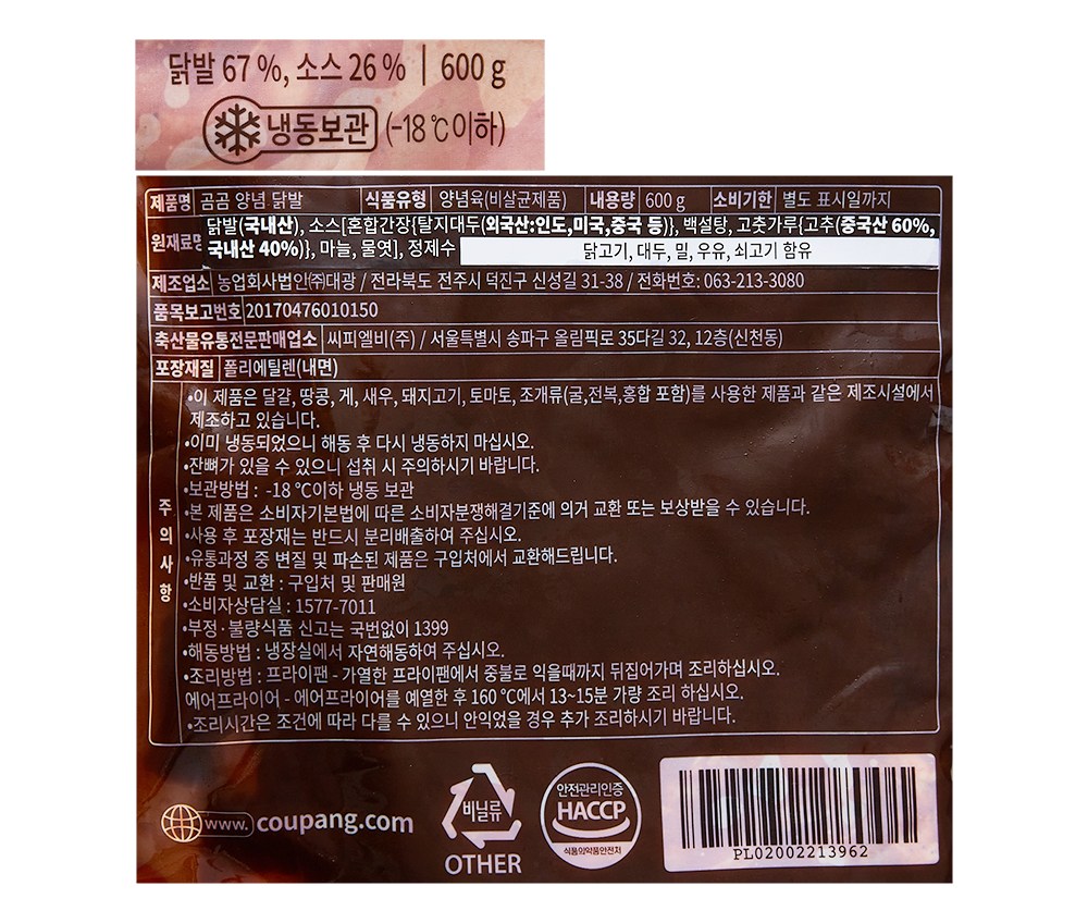 | 제품명 | 곰곰 양념 닭발 | 식품의 유형 | 컨텐츠 참조 |