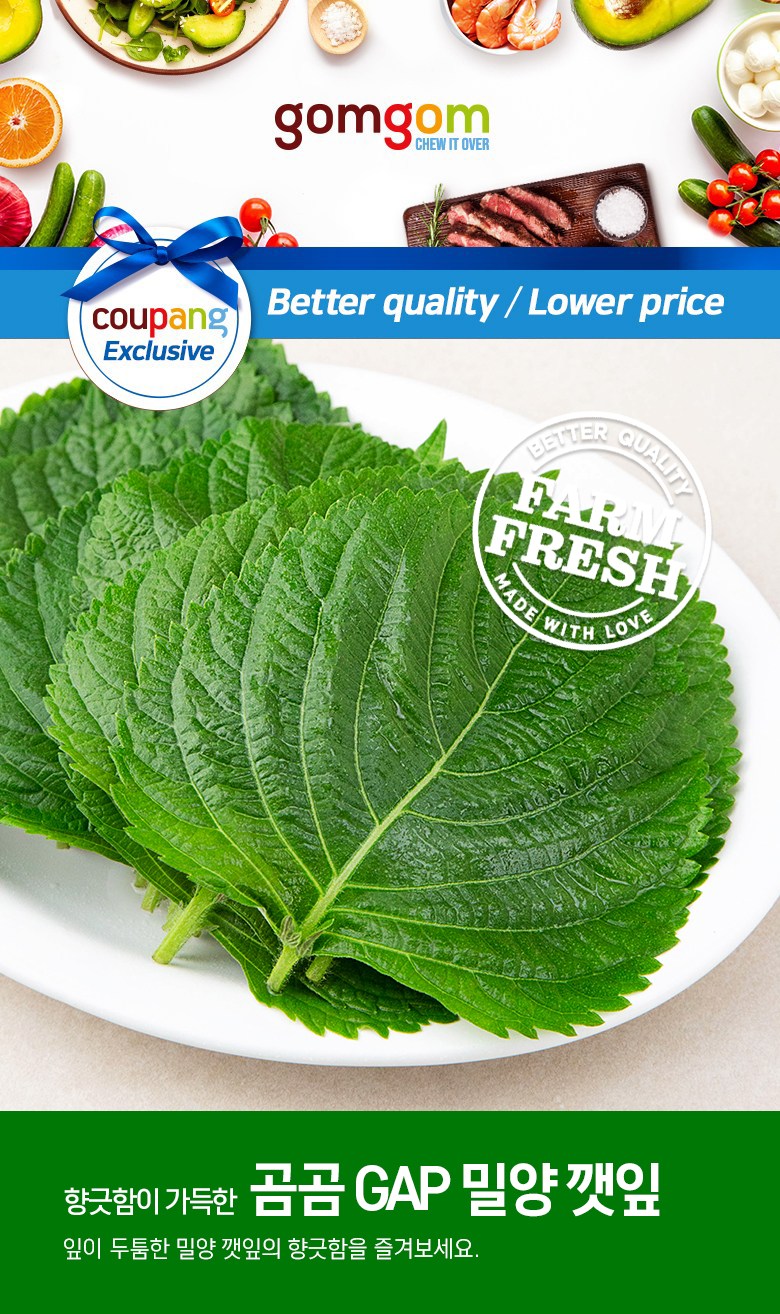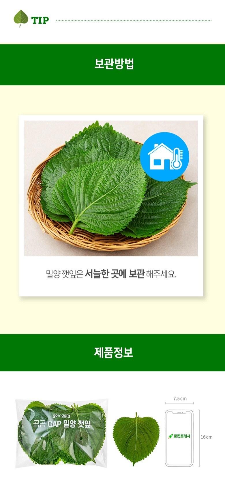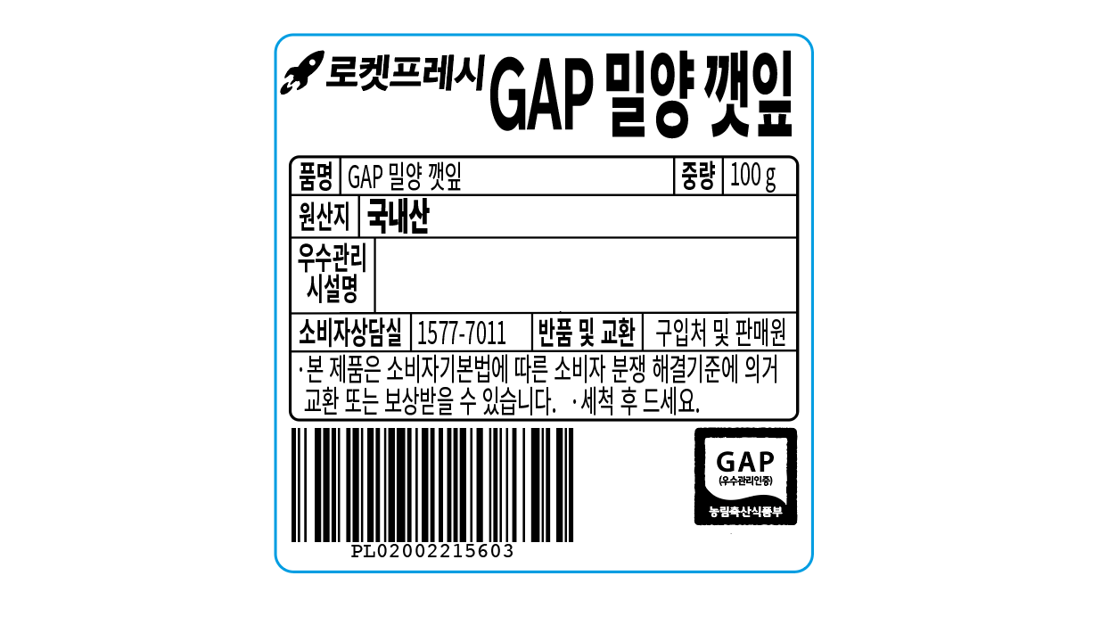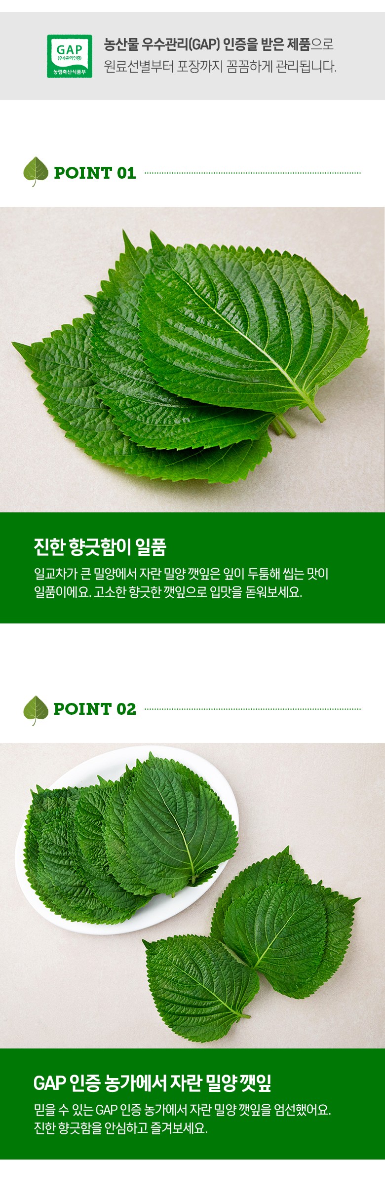 | 품목 또는 명칭 | GAP인증 밀양 깻잎 | 포장단위별 내용물의 용량(중량),수량,크기 | 100g x 2개 |