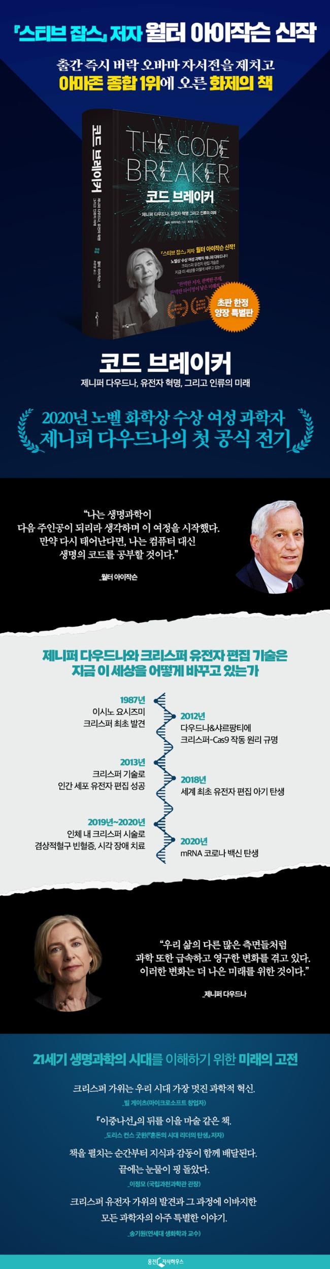 | 도서명 | [웅진지식하우스]코드 브레이커 : 제니퍼 다우드나 유전자 혁명 그리고 인류의 미래 | 저자, 출판사 | 웅진지식하우스,월터 아이작슨 |