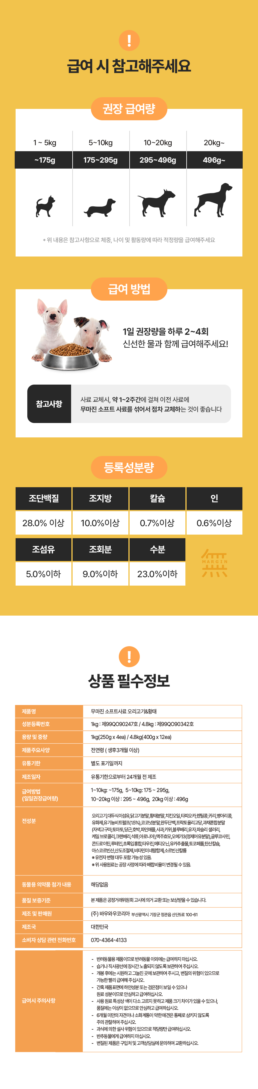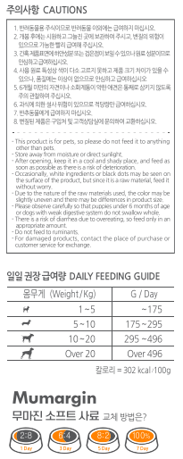 | 품명 및 모델명 | 무마진 소프트사료 오리고기&황태 | 인증사항 | 사료관리법에 따른 성분등록번호 : 컨텐츠 참조 |