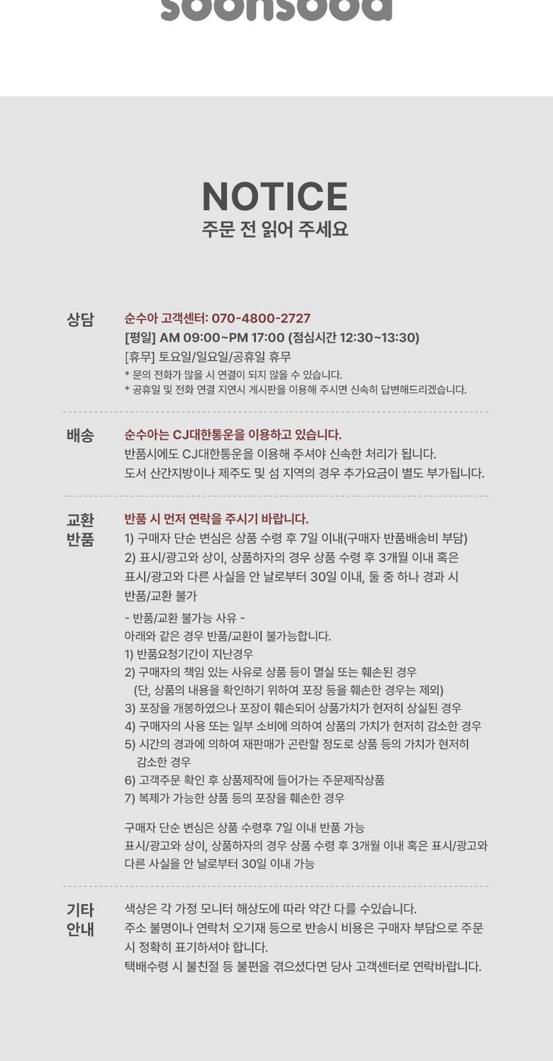 - ㆍ모니터 해상도의 차이로 인해 색상이나 이미지가 실제와 달라, 고객이 단순 변심으로 교환/반품을 무료로 요청하는 경우